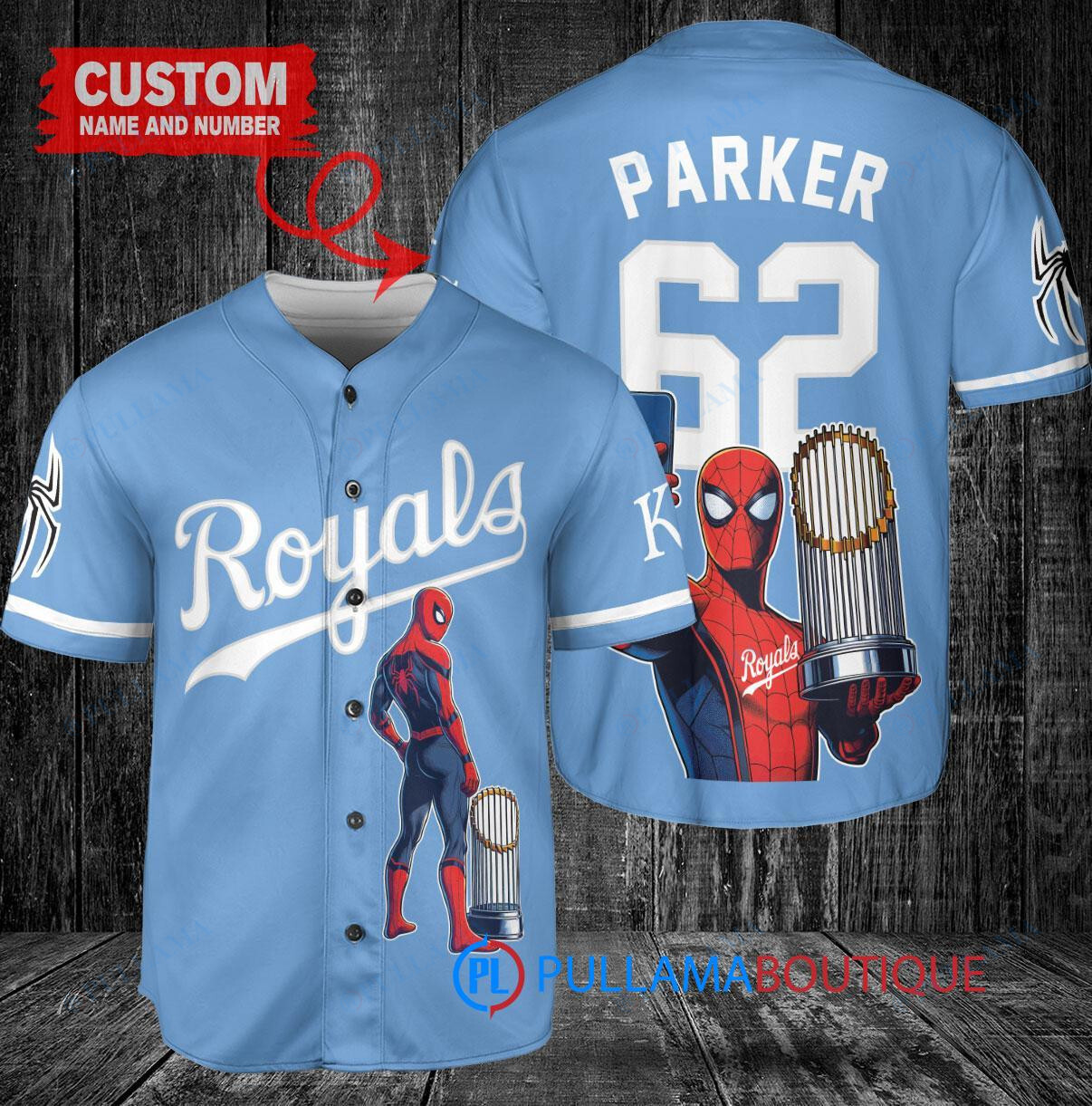 Kansas City Royals x Marvel Spiderman with Trophy Custom Baseball Jersey Light Blue