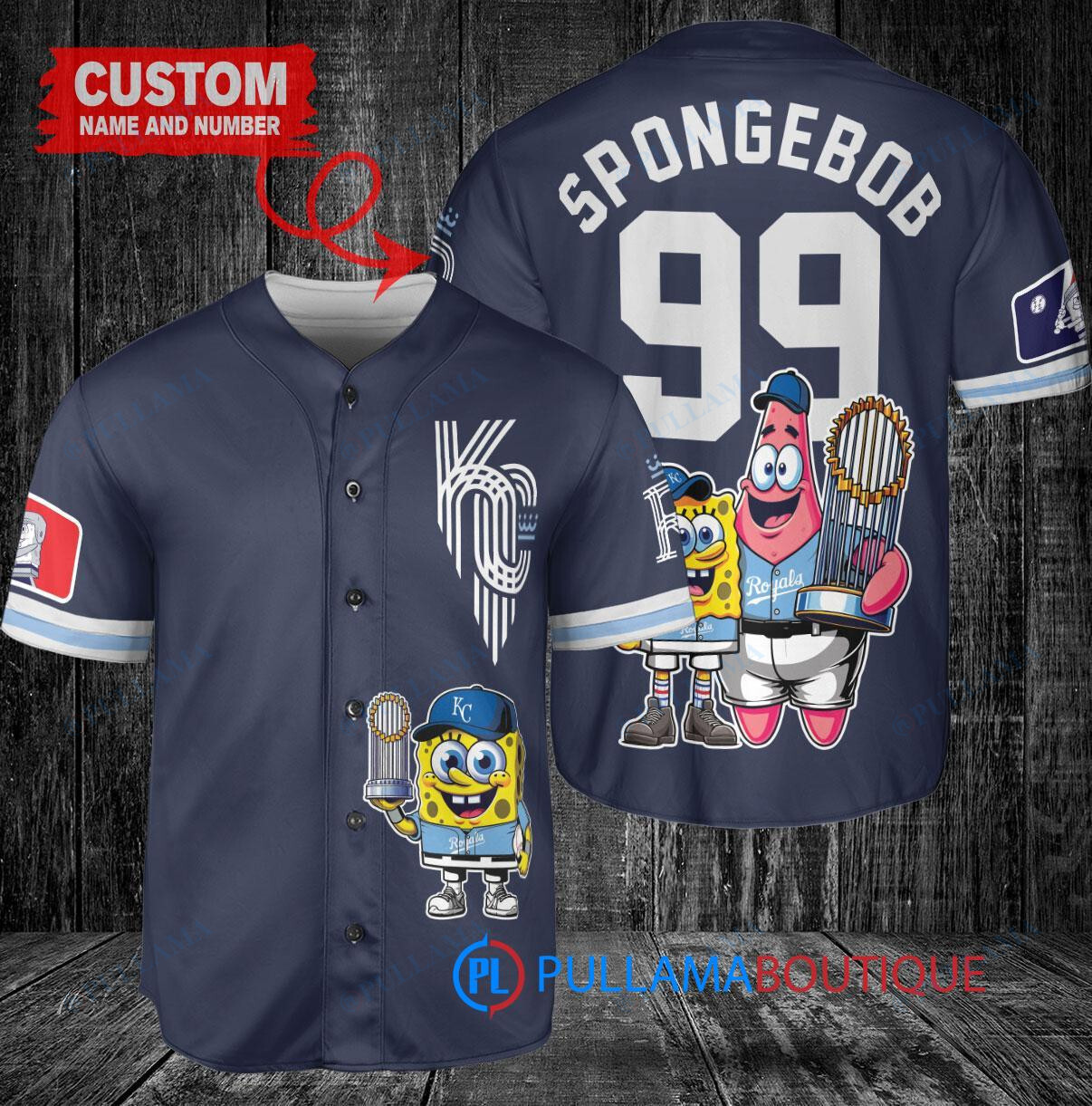 Show off your love for the Kansas City Royals and SpongeBob SquarePants with this custom baseball jersey in navy. Featuring a unique design with the trophy graphic, this jersey is perfect for any fan looking to stand out in the crowd. Made with high-quality materials, this jersey is comfortable to wear at the game or while hanging out with friends. Get your hands on this one-of-a-kind jersey and show your support for your favorite team and cartoon character in style.