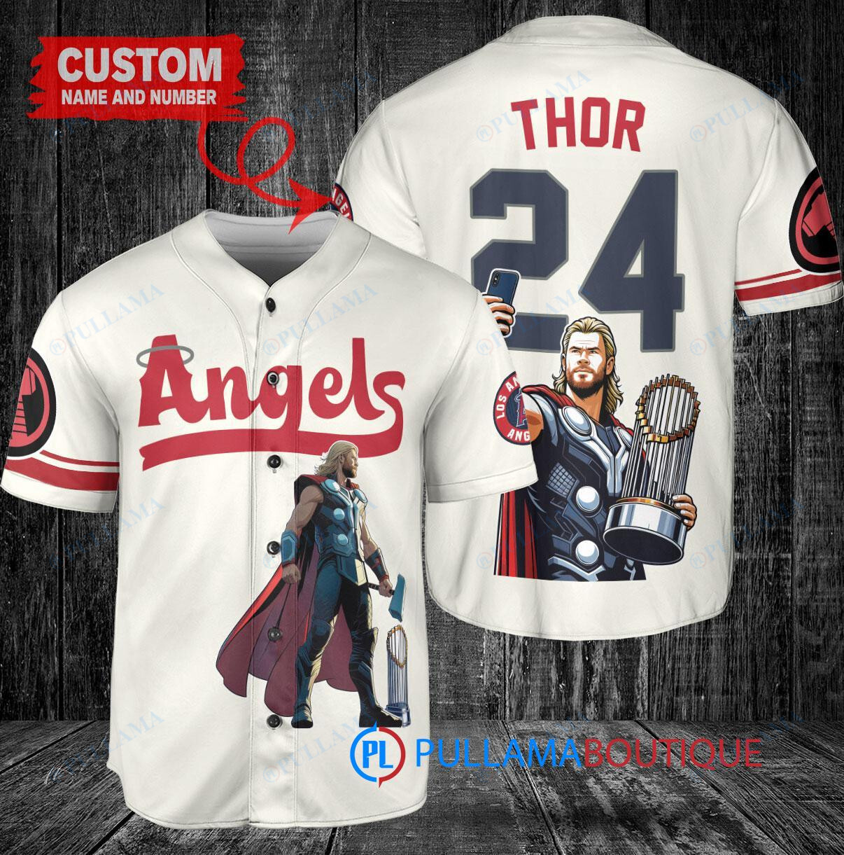 Show off your love for the Los Angeles Angels and Thor Marvel with this custom baseball jersey in cream color. This unique jersey features a collaboration design with Thor Marvel, complete with a trophy graphic. Perfect for any Angels fan looking to stand out at the game or just show off their favorite superhero. Made with high-quality materials, this jersey is a must-have for any collector or fan.
