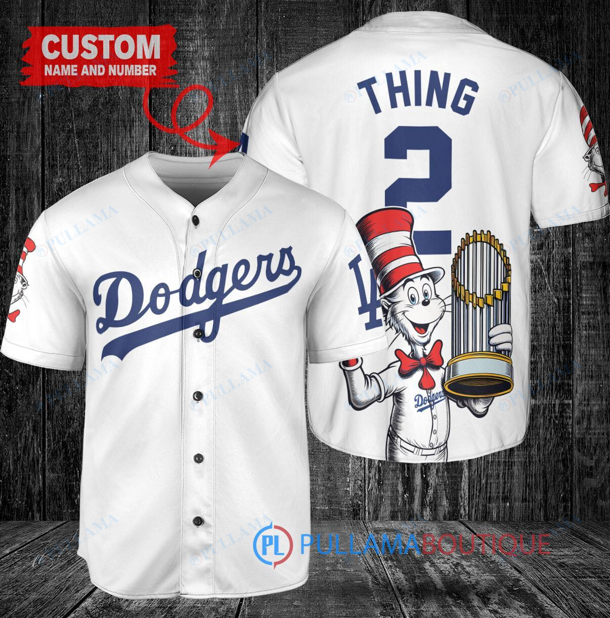 Show your love for the Los Angeles Dodgers in a unique way with this custom baseball jersey featuring a Dr. Seuss design and the World Series Trophy. This white jersey is perfect for any Dodgers fan looking to stand out from the crowd. Made with high-quality materials, this jersey is comfortable to wear while showing off your team pride. Get yours today and cheer on the Dodgers in style!