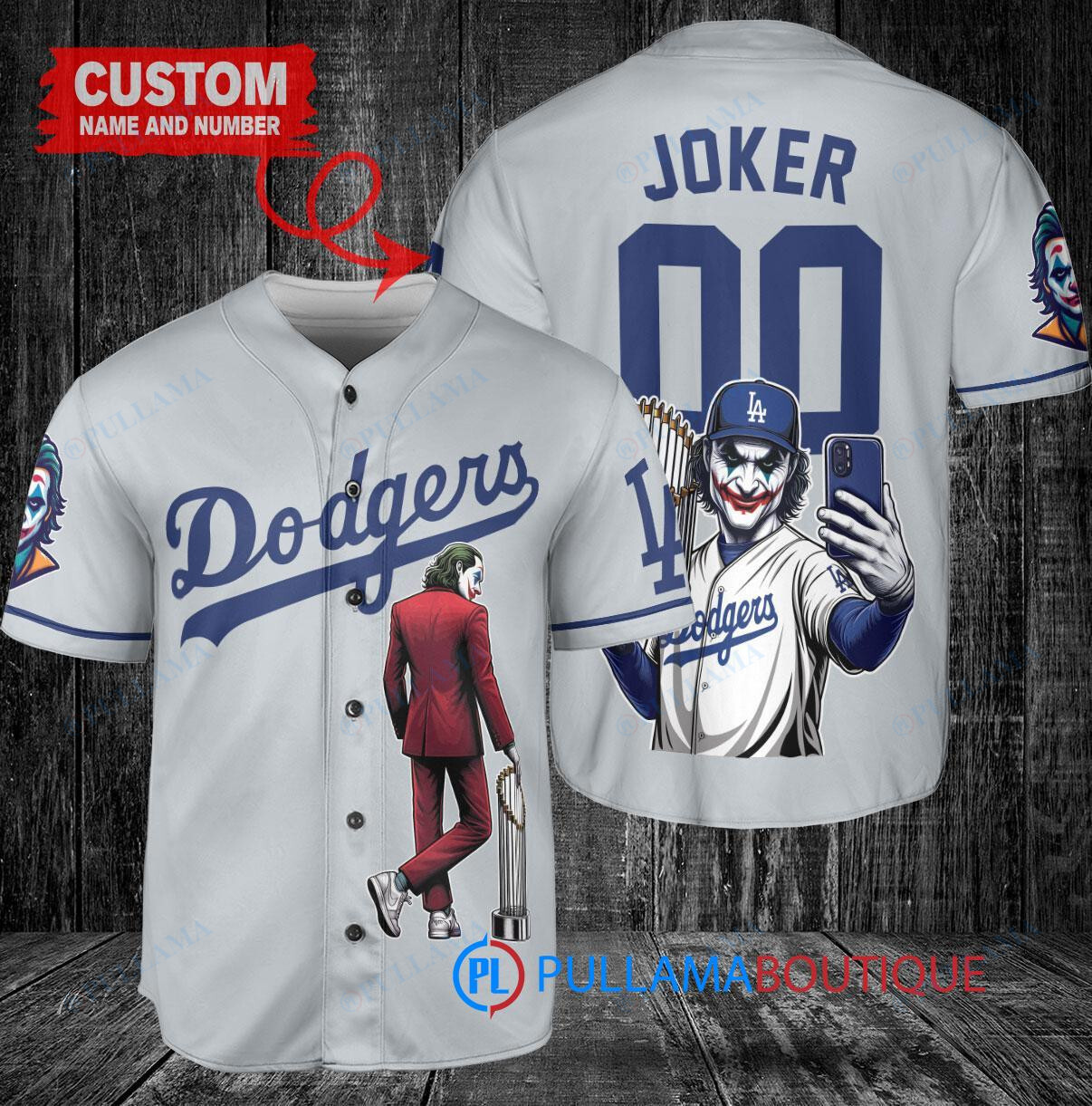 Show off your love for the Los Angeles Dodgers and the Joker from DC Comics with this custom baseball jersey in gray. Featuring a unique design with the Joker holding a trophy, this jersey is perfect for any fan looking to stand out in the crowd. Made with high-quality materials, this jersey is comfortable to wear while showing off your favorite team and character. Perfect for game days or casual wear, this jersey is a must-have for any die-hard fan.