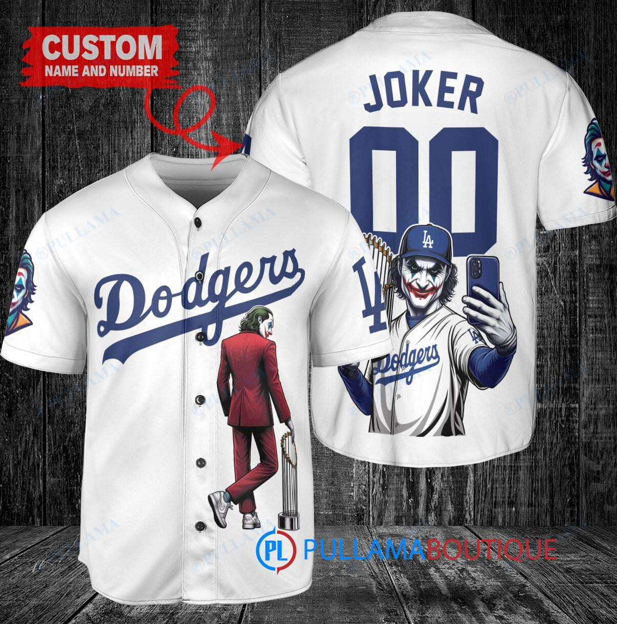 Show off your love for the Los Angeles Dodgers and the Joker from DC Comics with this custom baseball jersey. The white jersey features a unique design with the Joker holding a trophy, perfect for any fan looking to stand out in the crowd. Made with high-quality materials, this jersey is both stylish and comfortable, making it a great addition to any fan’s collection. Whether you’re heading to the game or just want to show off your fandom, this jersey is sure to turn heads.