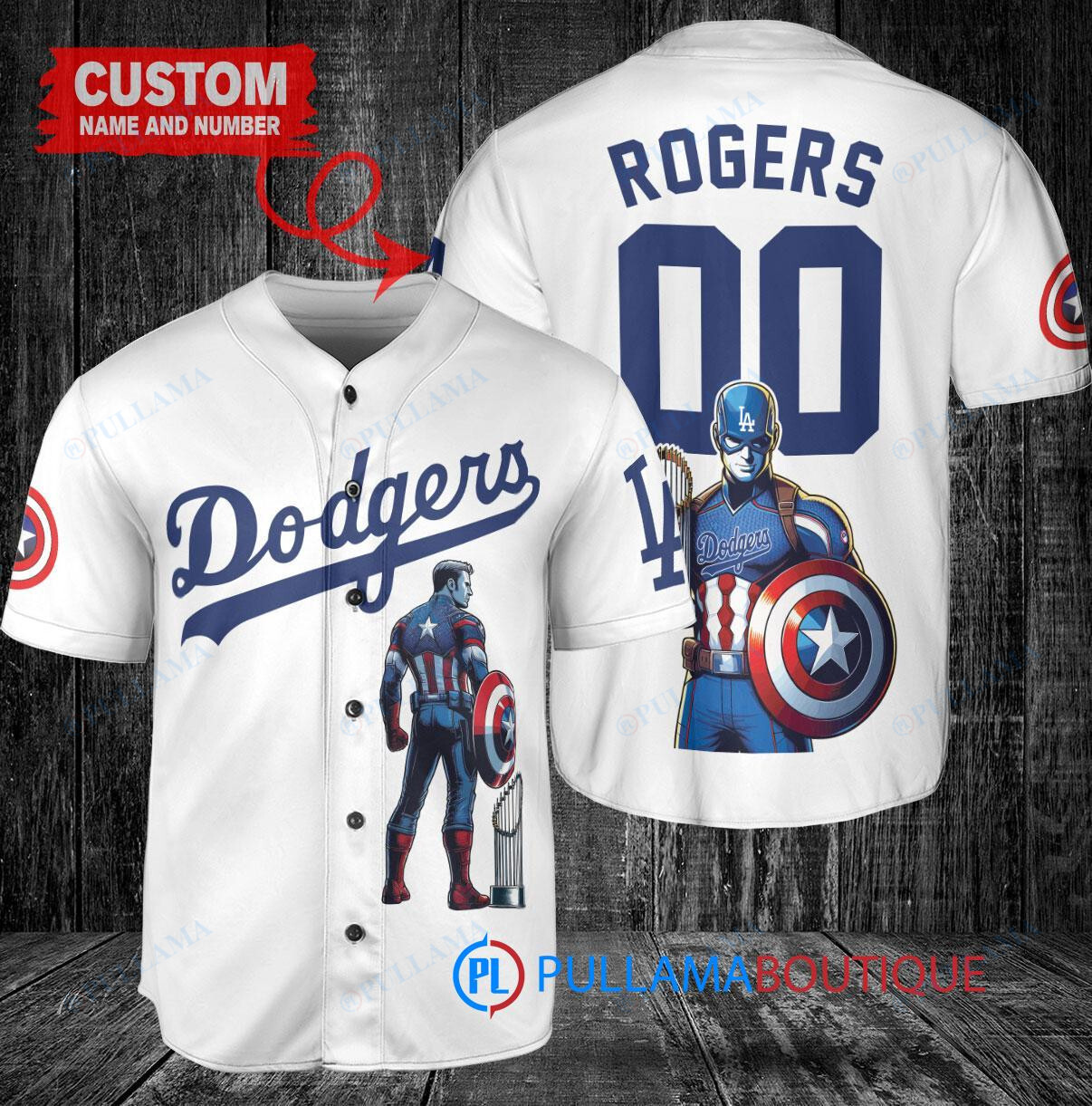 Los Angeles Dodgers x Marvel Captain America Steve Rogers with Trophy Custom Baseball Jersey White