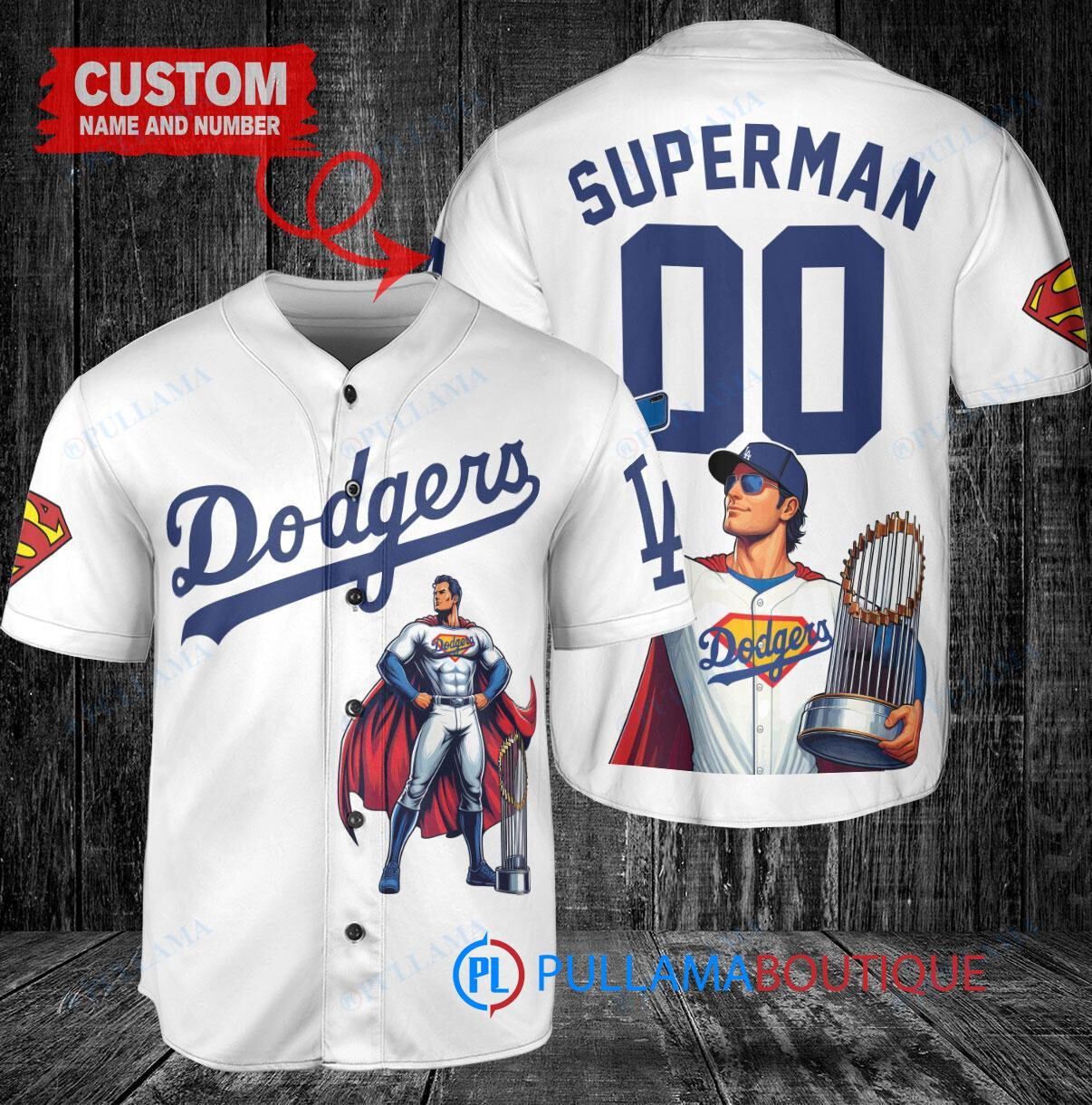 Los Angeles Dodgers x Superman DC Comics with Trophy Custom Baseball Jersey White