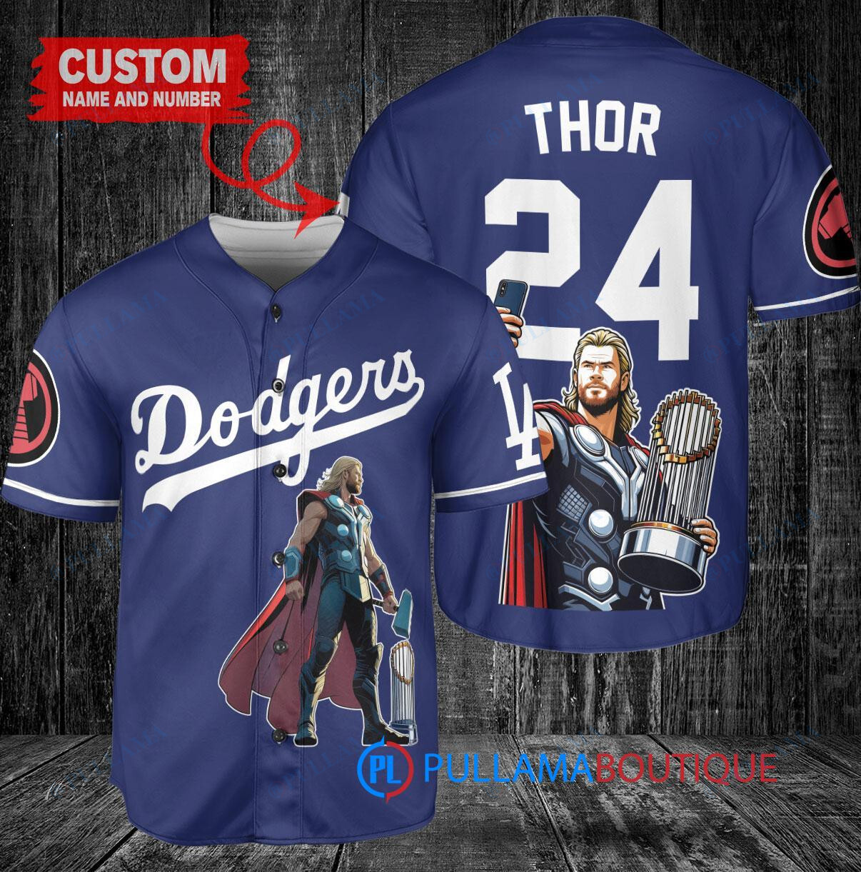 Show off your love for the Los Angeles Dodgers and Thor Marvel with this custom baseball jersey in navy. Featuring a unique design with the iconic Thor character holding a trophy, this jersey is perfect for any fan looking to stand out in the crowd. Made with high-quality materials, this jersey is comfortable to wear while showing off your team spirit. Perfect for game days or casual wear, this jersey is a must-have for any Dodgers and Marvel fan.