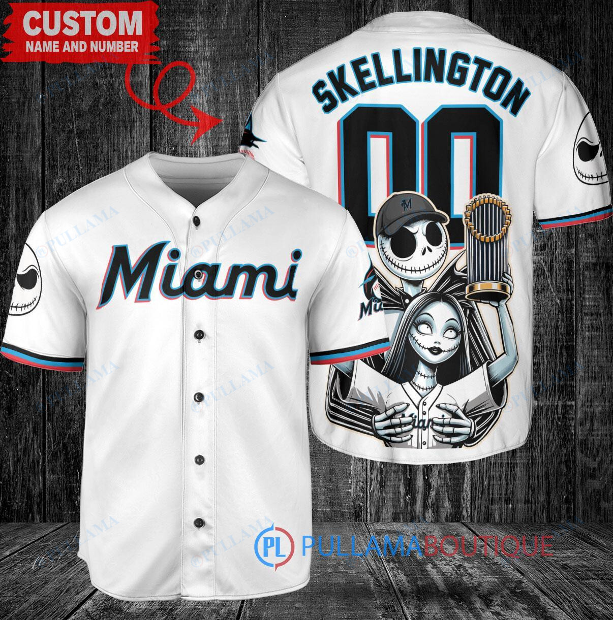 Show your love for the Miami Marlins with this unique Jack Skellington and Sally World Series Trophy baseball jersey. This white jersey features a striking design of Jack Skellington and Sally from The Nightmare Before Christmas holding a World Series Trophy. Perfect for any Marlins fan looking to stand out in the crowd.