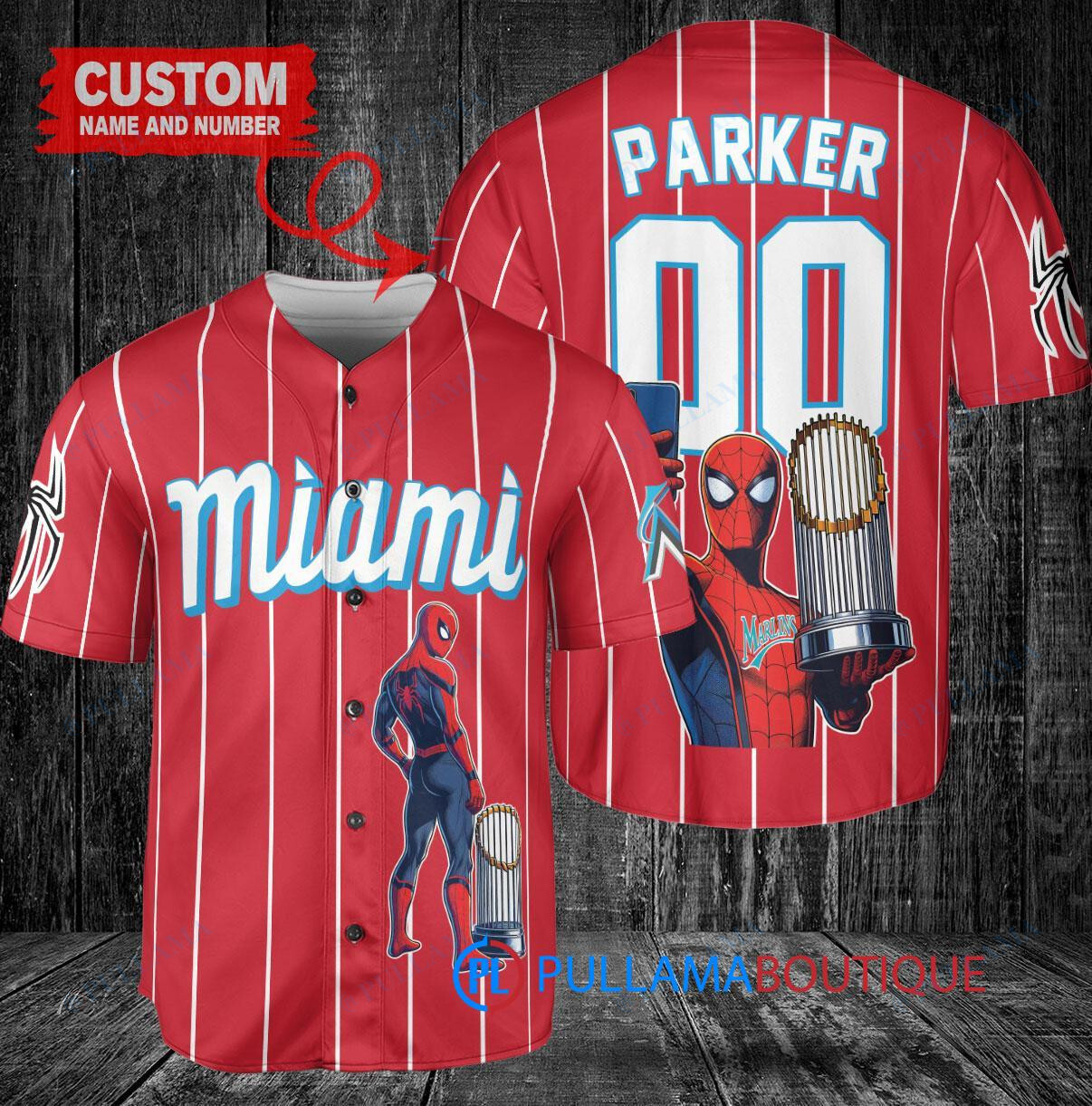 Miami Marlins x Marvel Spiderman with Trophy Custom Baseball Jersey Red