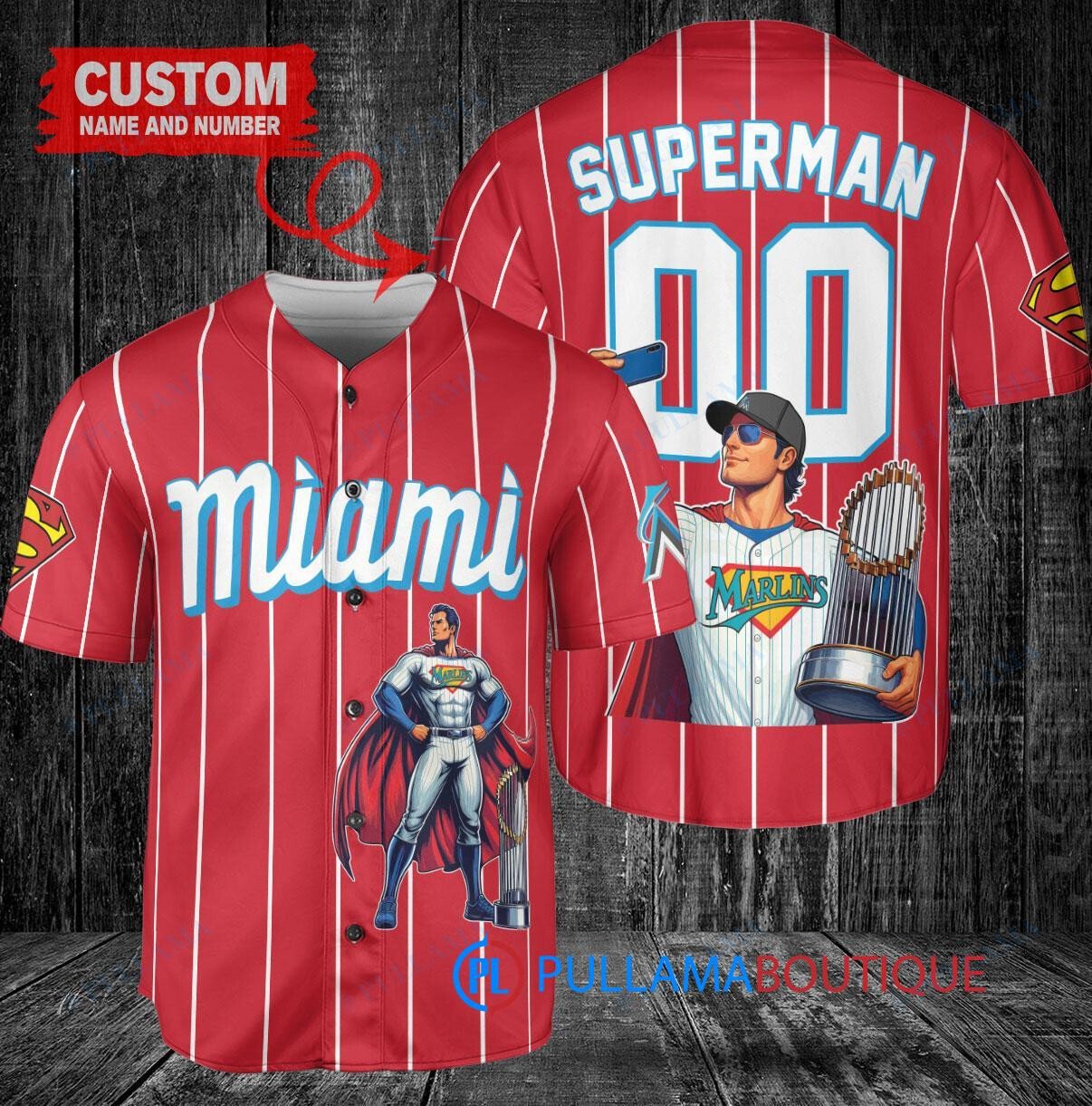 Show off your love for the Miami Marlins and Superman with this custom baseball jersey in red. Featuring a unique design collaboration with DC Comics, this jersey is perfect for any fan looking to stand out. The jersey also includes a trophy design, adding an extra touch of style. Get ready to hit a home run in style with this one-of-a-kind jersey!