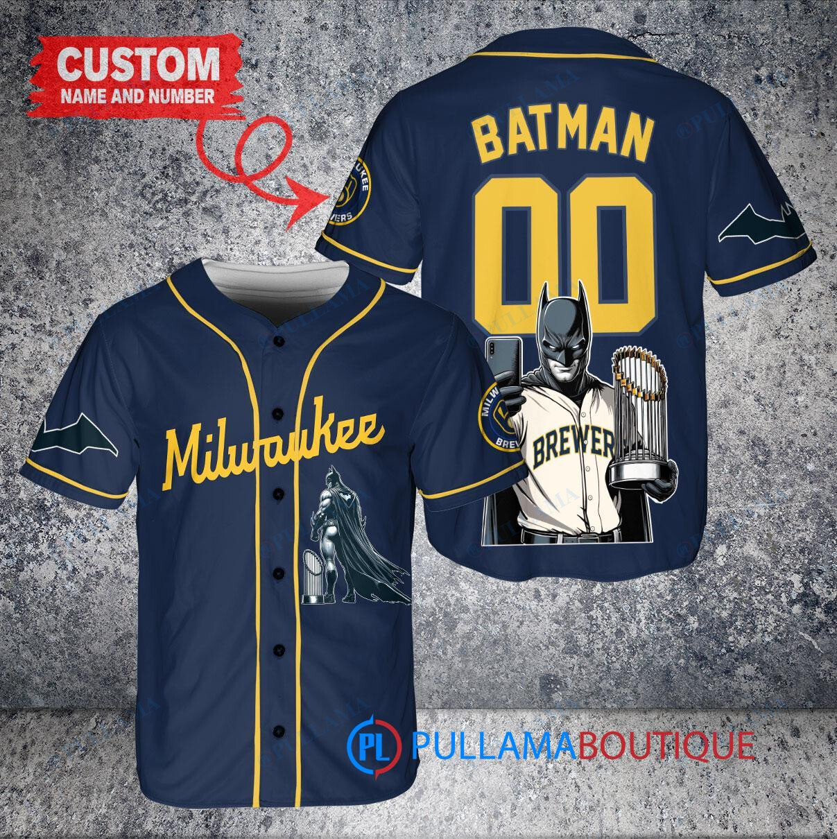 Milwaukee Brewers x DC Comics Batman The Dark Knight with Trophy Custom Baseball Jersey Navy