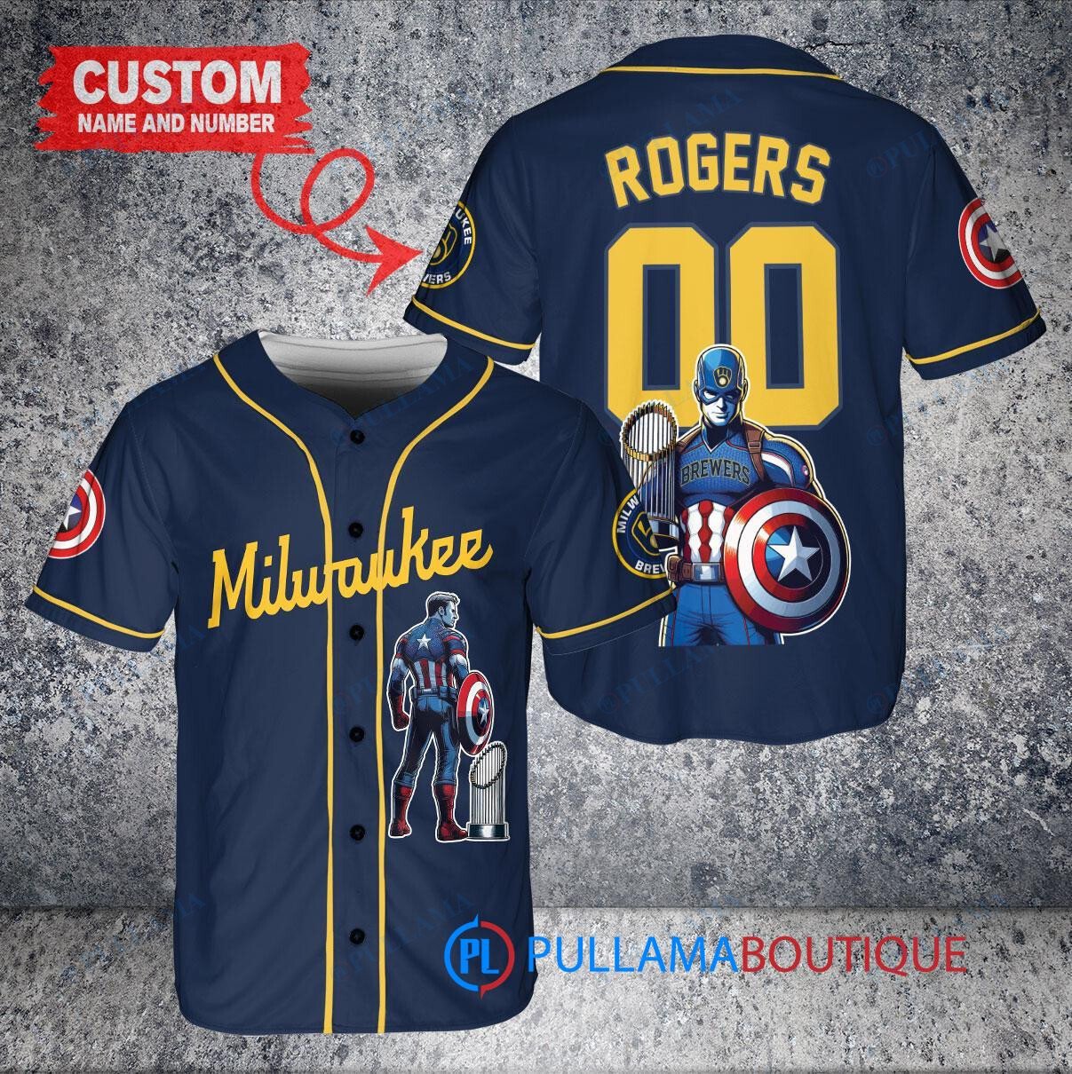 Milwaukee Brewers x Marvel Captain America Steve Rogers with Trophy Custom Baseball Jersey Navy