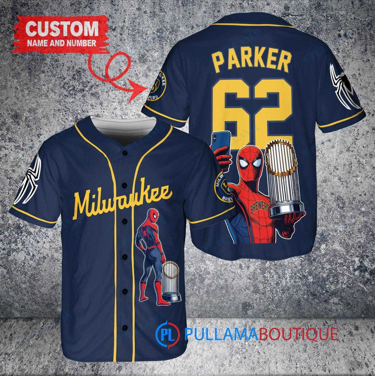 Show off your love for the Milwaukee Brewers and Marvel’s Spiderman with this custom baseball jersey in navy. Featuring a unique design of Spiderman holding a trophy, this jersey is perfect for any fan looking to stand out in the crowd. Made with high-quality materials, this jersey is comfortable to wear while cheering on your favorite team. Get yours today and swing into action with style!
