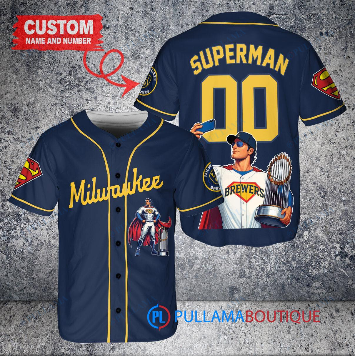Milwaukee Brewers x Superman DC Comics with Trophy Custom Baseball Jersey Navy