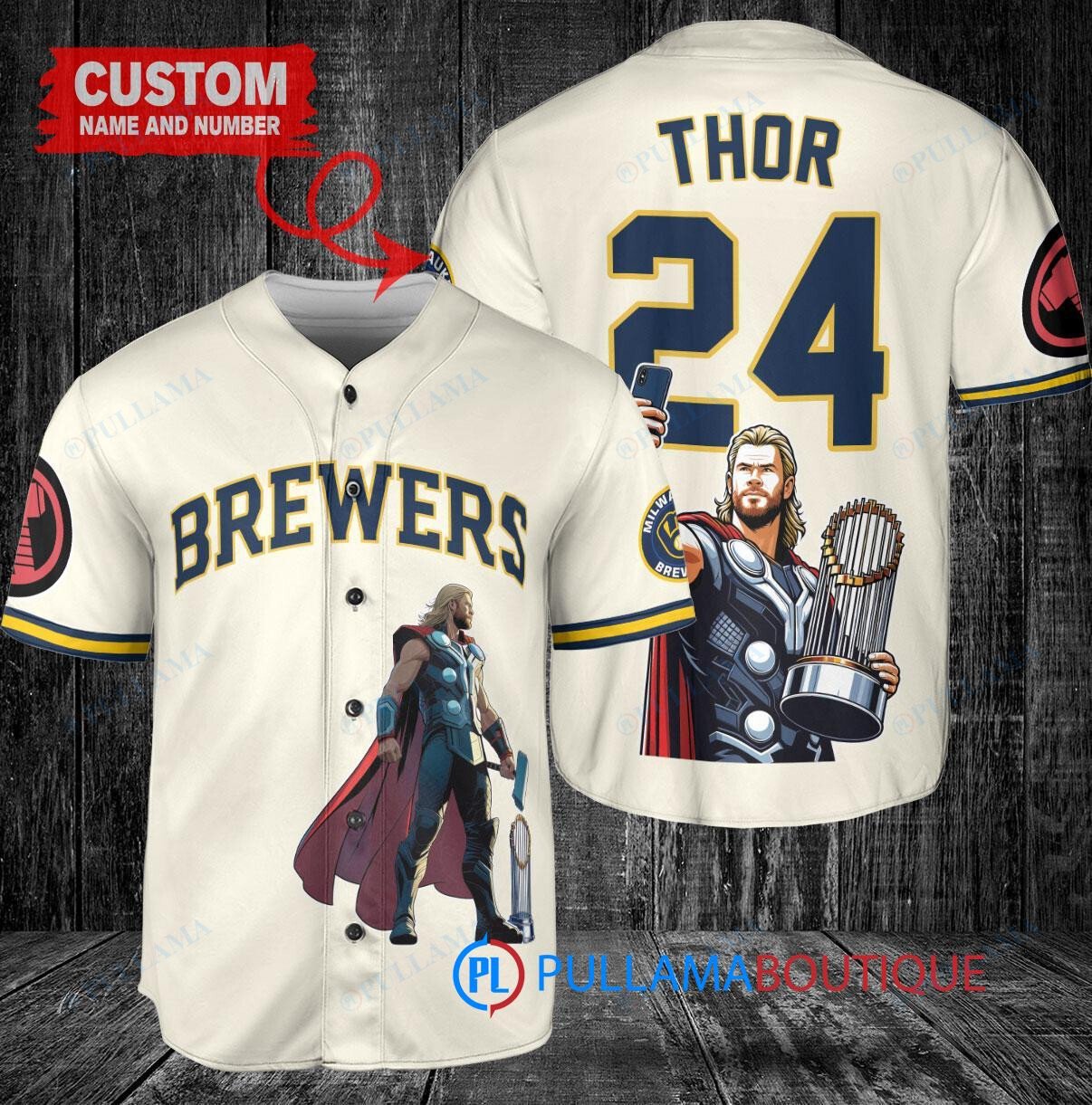 Show off your love for the Milwaukee Brewers and Thor Marvel with this custom baseball jersey in cream color. This unique jersey features a Thor Marvel design along with a trophy graphic, making it a must-have for any fan. Made with high-quality materials, this jersey is perfect for game days or casual wear. Get yours today and stand out from the crowd!