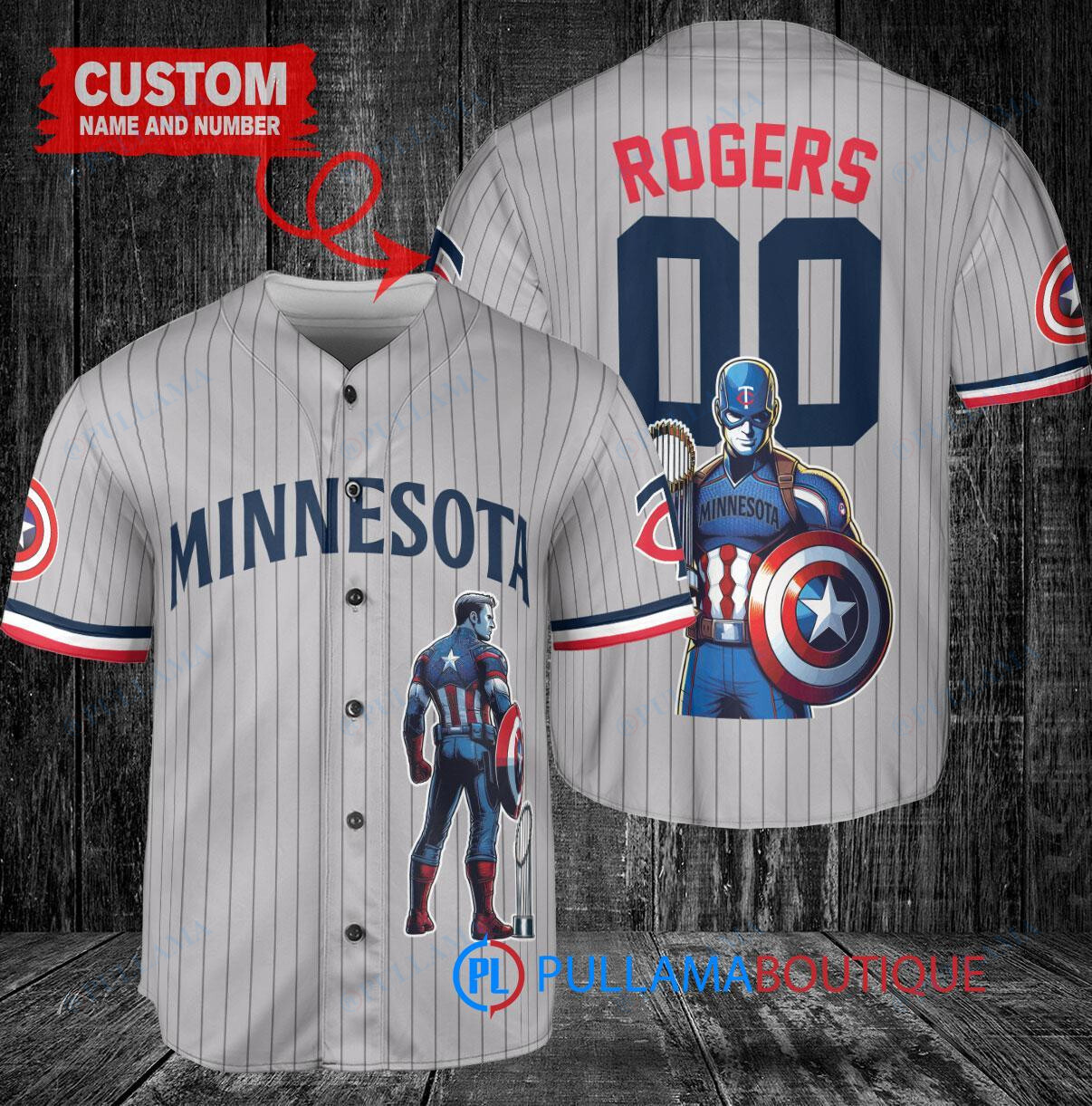 Show your support for the Minnesota Twins with this custom baseball jersey featuring Marvel’s Captain America Steve Rogers. The gray road jersey is designed with the team’s logo and colors, along with a trophy emblem to celebrate their victories. Perfect for any Twins fan or Marvel enthusiast, this jersey is a unique and stylish way to represent your favorite team and superhero.