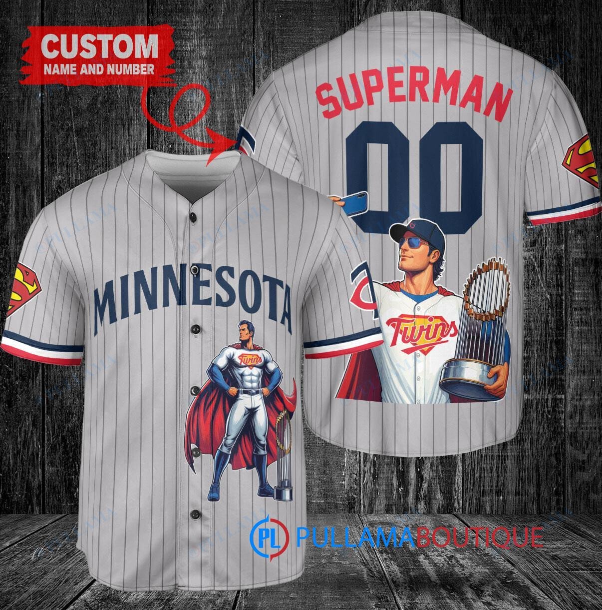 Minnesota Twins x Superman DC Comics with Trophy Custom Baseball Jersey Gray Road