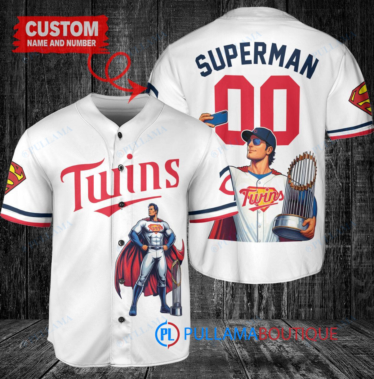 Show off your love for the Minnesota Twins and Superman with this custom baseball jersey featuring a unique DC Comics design. The white jersey is accented with the iconic Superman logo and comes with a trophy emblem, perfect for any fan looking to stand out in the crowd. Made with high-quality materials, this jersey is a must-have for any baseball enthusiast.