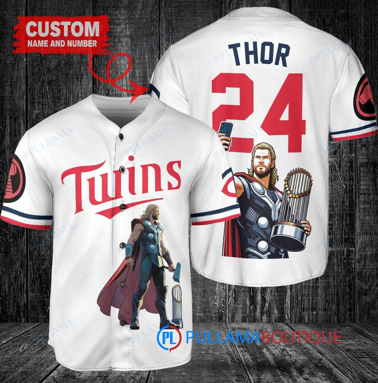 Show off your love for the Minnesota Twins and Thor with this custom baseball jersey. The white jersey features a unique design combining the iconic Twins logo with Thor from Marvel, complete with a trophy graphic. Perfect for any Twins fan who also loves the superhero world. Get yours today and stand out at the next game!
