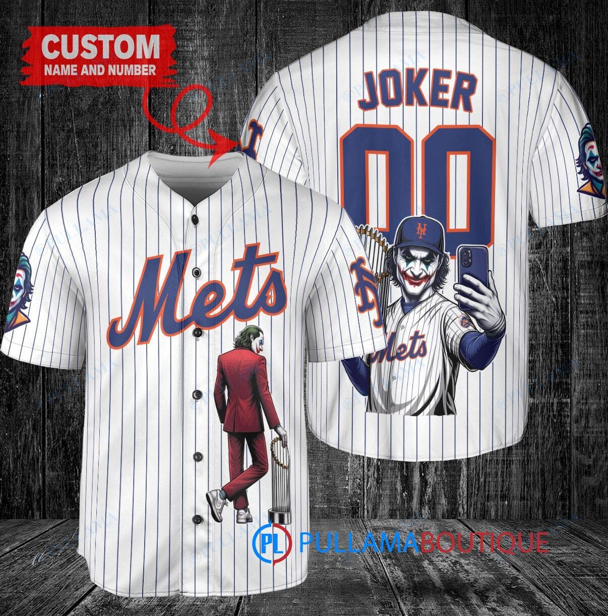 Show off your love for the New York Mets and the Joker from DC Comics with this custom baseball jersey. The white jersey features a unique design with the Joker holding a trophy, perfect for any fan of the team and the iconic comic book character. Made with high-quality materials, this jersey is perfect for wearing to games or just showing off your fandom. Get yours today and stand out from the crowd!