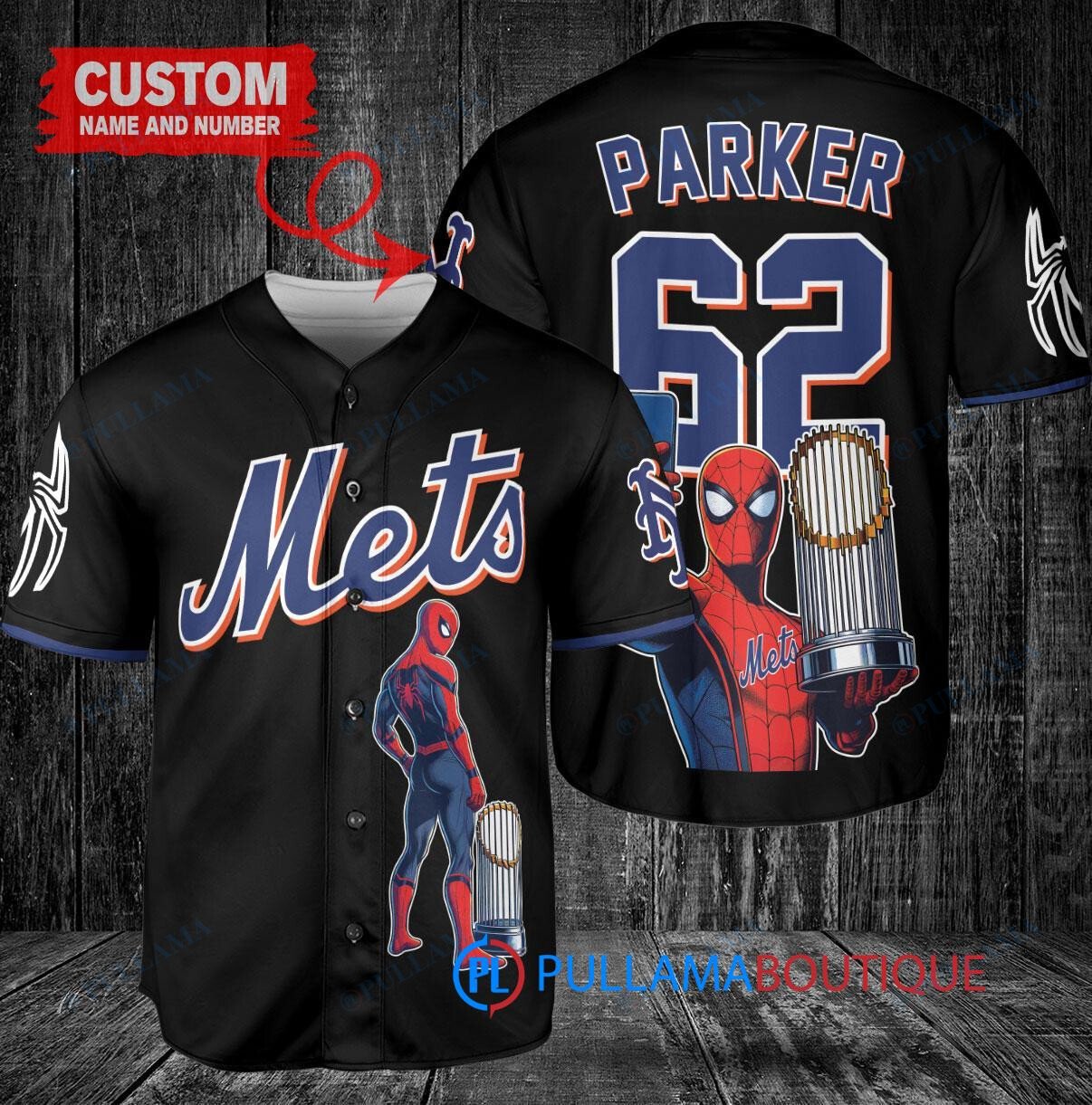 New York Mets x Marvel Spiderman with Trophy Custom Baseball Jersey Black