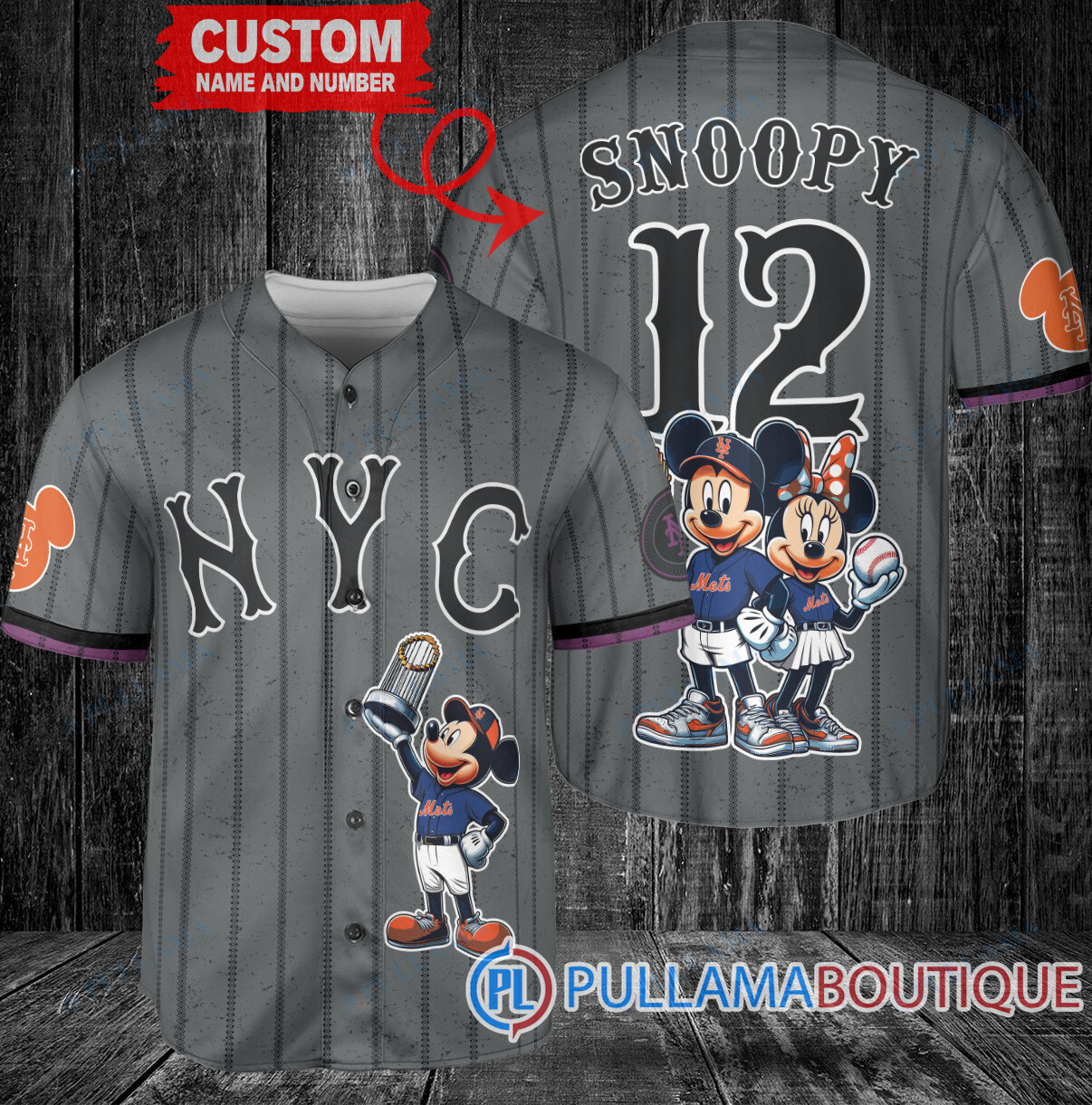 Celebrate the New York Mets in style with this Mickey and Minnie Trophy Baseball Jersey in Graphite City Connect design. This unique jersey features a fun and playful twist with the beloved Disney characters Mickey and Minnie Mouse holding a trophy. Perfect for any Mets fan looking to show off their team spirit in a fun and creative way. Made with high-quality materials for a comfortable fit and durable wear. Add a touch of magic to your game day outfit with this one-of-a-kind jersey.