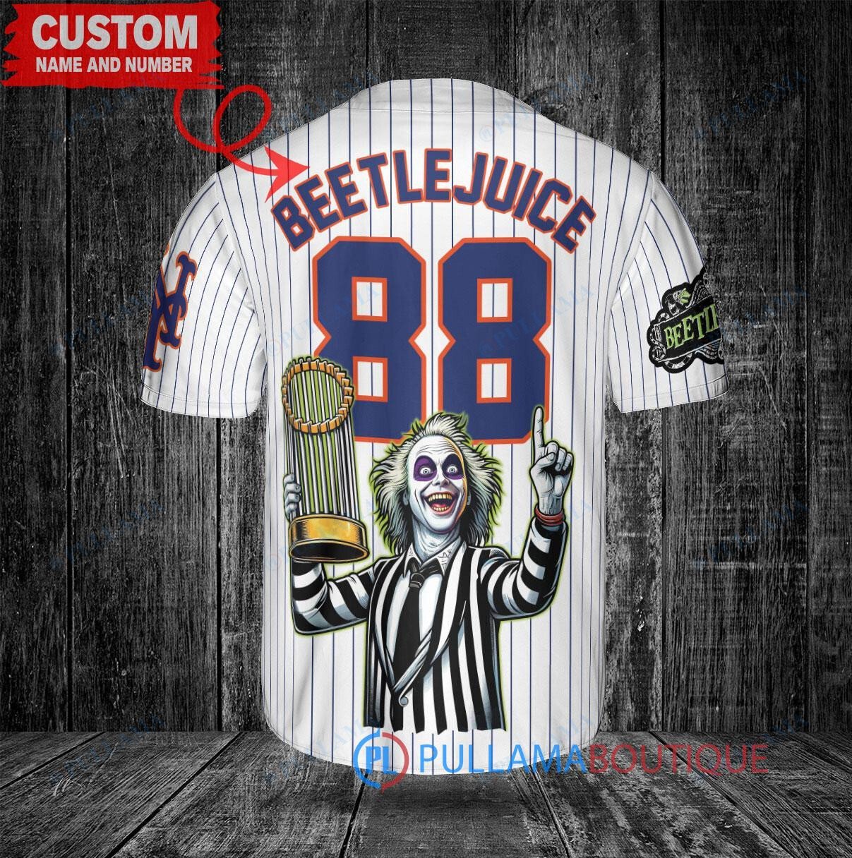 Celebrate Halloween in style with this NY Mets x Beetlejuice World Series Trophy Baseball Jersey in white. This unique jersey features a spooky Beetlejuice design on the front and back, perfect for fans of both the NY Mets and the classic movie. Made with high-quality materials, this jersey is perfect for wearing to games or Halloween parties. Get into the Halloween spirit and show off your team pride with this one-of-a-kind baseball jersey.