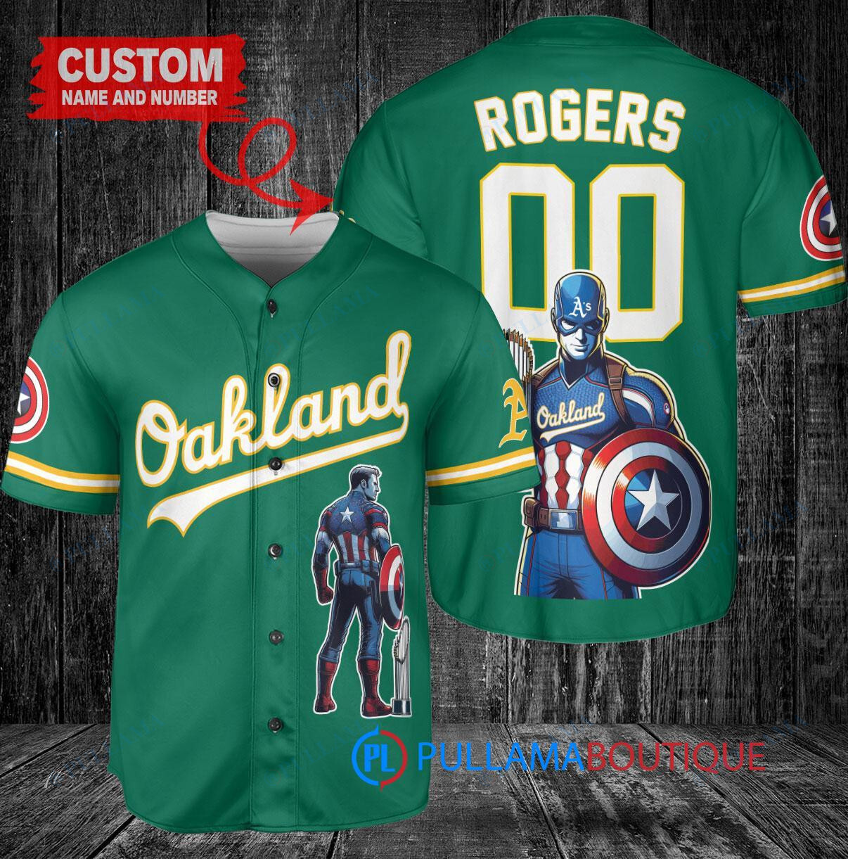 Oakland Athletics x Marvel Captain America Steve Rogers with Trophy Custom Baseball Jersey Green