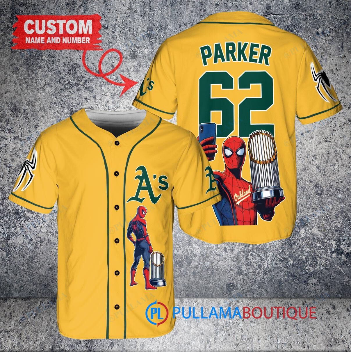 Show off your Oakland Athletics pride with this custom baseball jersey featuring a unique Marvel Spiderman design. Made with high-quality materials, this gold jersey is perfect for any fan looking to stand out from the crowd. Complete with a trophy graphic, this jersey is sure to make a statement at the next game or event. Get yours today and swing into action with style!