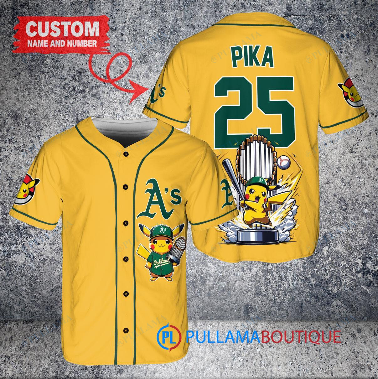 Show your love for the Oakland Athletics and Pikachu with this custom baseball jersey featuring a Pikachu Pokemon holding a trophy. The jersey is designed in gold and is perfect for any fan looking to stand out in the crowd. Made with high-quality materials, this jersey is a must-have for any baseball and Pokemon enthusiast. Get yours today and show off your unique style at the next game!