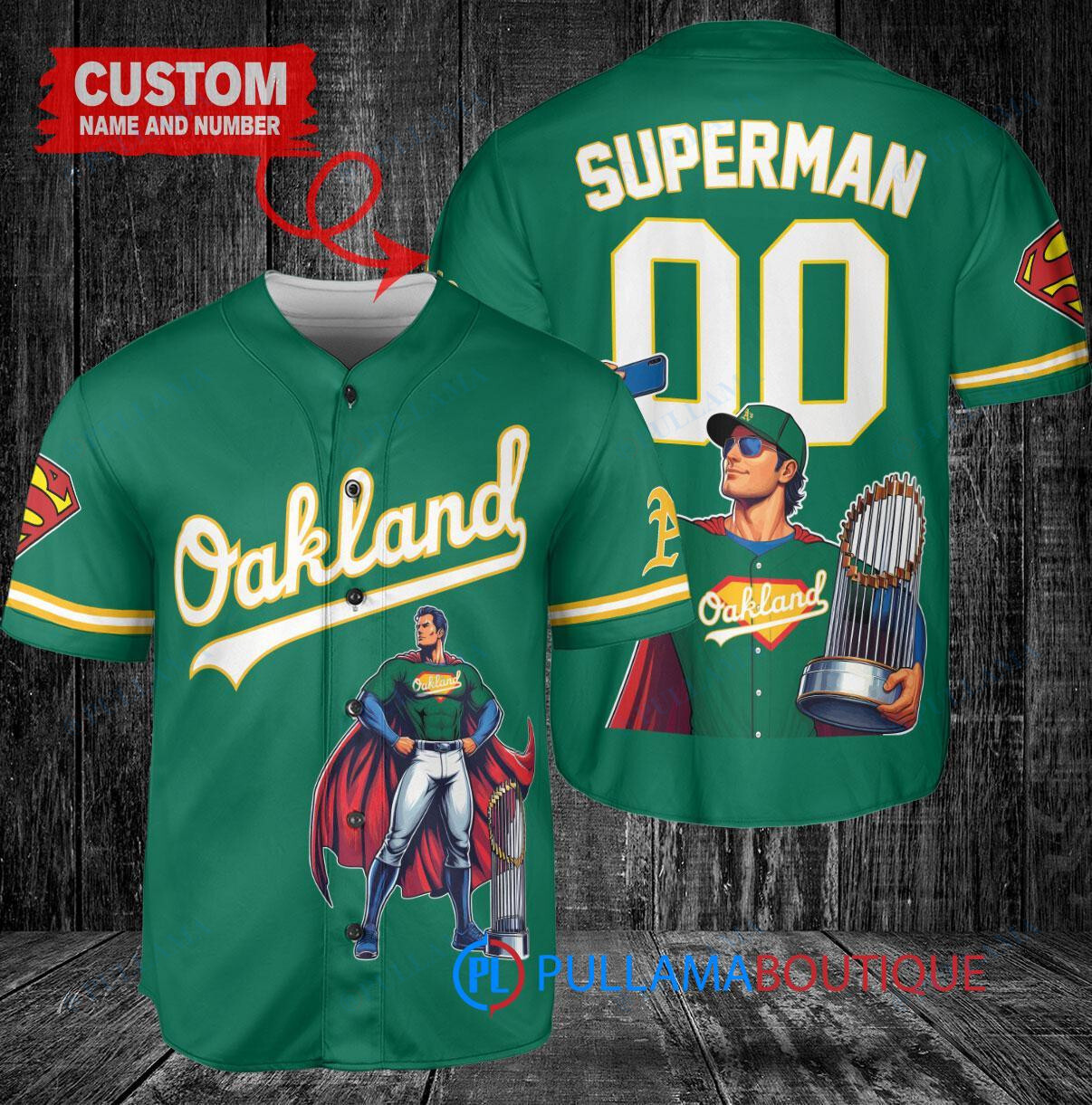 Show off your Oakland Athletics pride with this custom baseball jersey featuring a unique Superman DC Comics design. The jersey is green in color and includes a trophy graphic, perfect for any fan looking to stand out in the crowd. Made with high-quality materials, this jersey is both stylish and comfortable, making it a great addition to any fan’s collection. Get ready to cheer on your favorite team in style with this one-of-a-kind jersey!