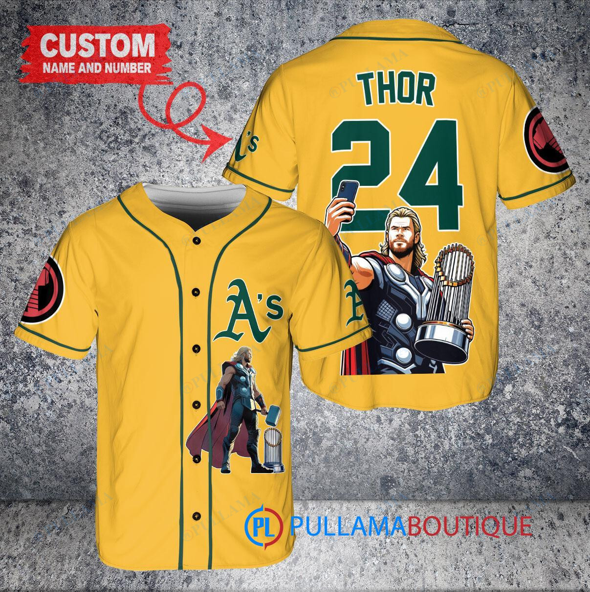 Show off your Oakland Athletics pride with this custom baseball jersey featuring a unique Thor Marvel design and a trophy emblem. Made with high-quality materials, this gold jersey is perfect for any fan looking to stand out in the crowd. Whether you’re at the game or just out and about, this jersey is sure to turn heads and make a statement. Get yours today and show your support for your favorite team in style!