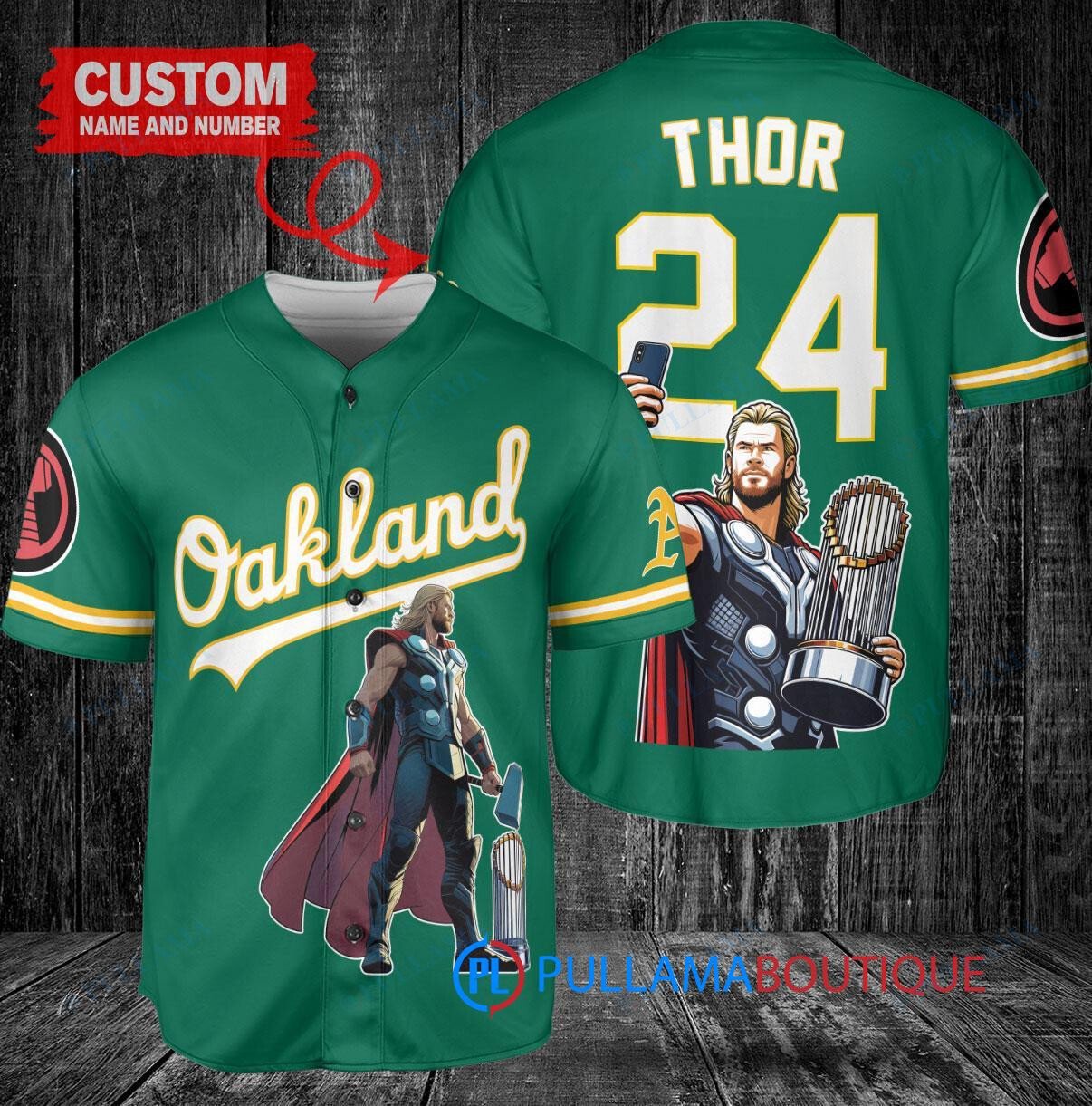 Show off your Oakland Athletics pride with this custom baseball jersey featuring a unique Thor Marvel design and trophy emblem. This green jersey is perfect for any fan looking to stand out in the crowd. Made with high-quality materials, this jersey is both stylish and comfortable, making it a great addition to any fan’s collection. Get yours today and hit a home run with your game day outfit!