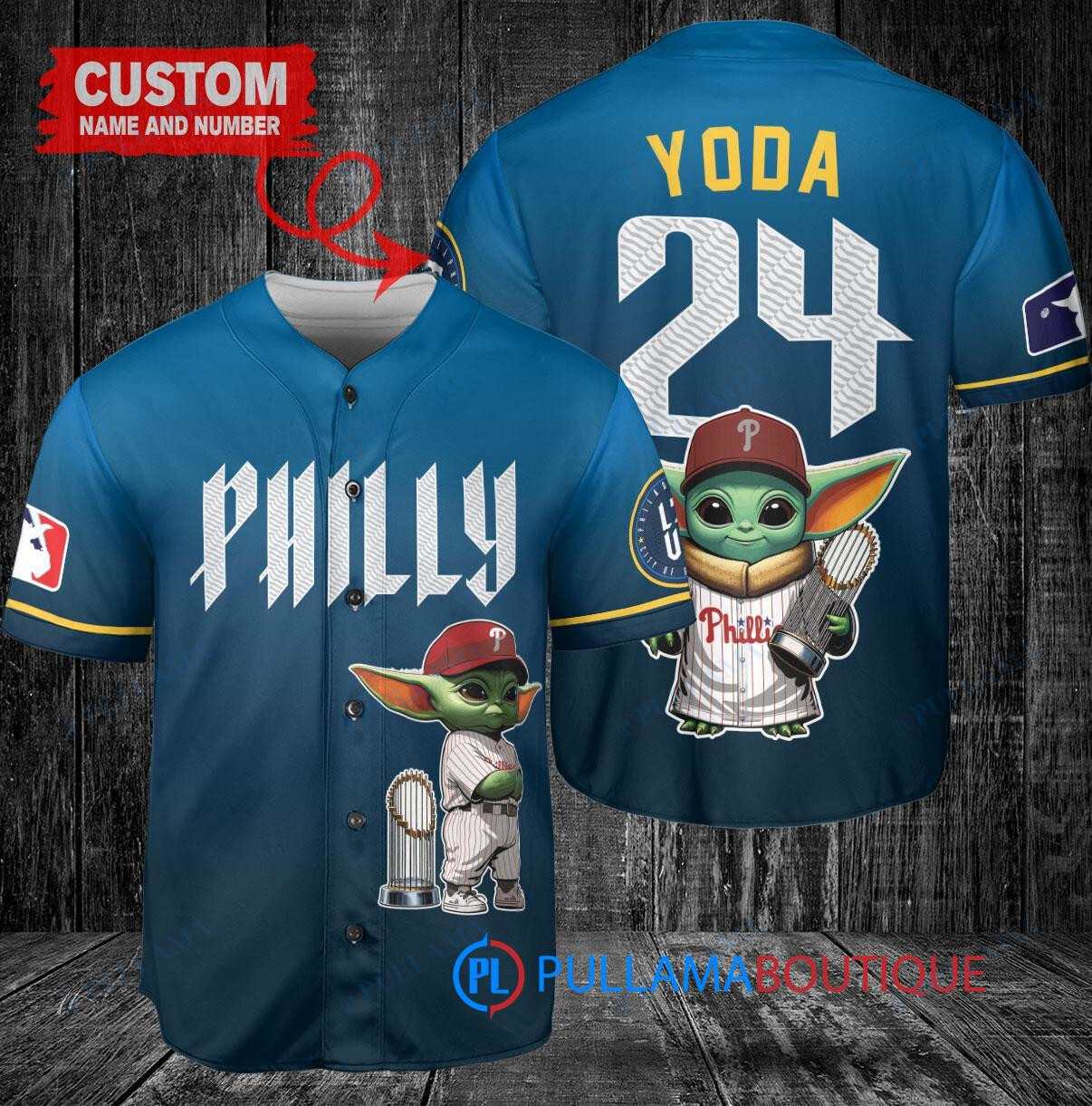 Show off your love for the Philadelphia Phillies and Baby Yoda with this custom baseball jersey inspired by Star Wars The Mandalorian. The jersey features a unique design with Baby Yoda holding a trophy, perfect for any fan of the popular series. Made with high-quality materials, this blue City Connect jersey is a must-have for any baseball and Star Wars enthusiast. Stand out from the crowd and add this one-of-a-kind jersey to your collection today!