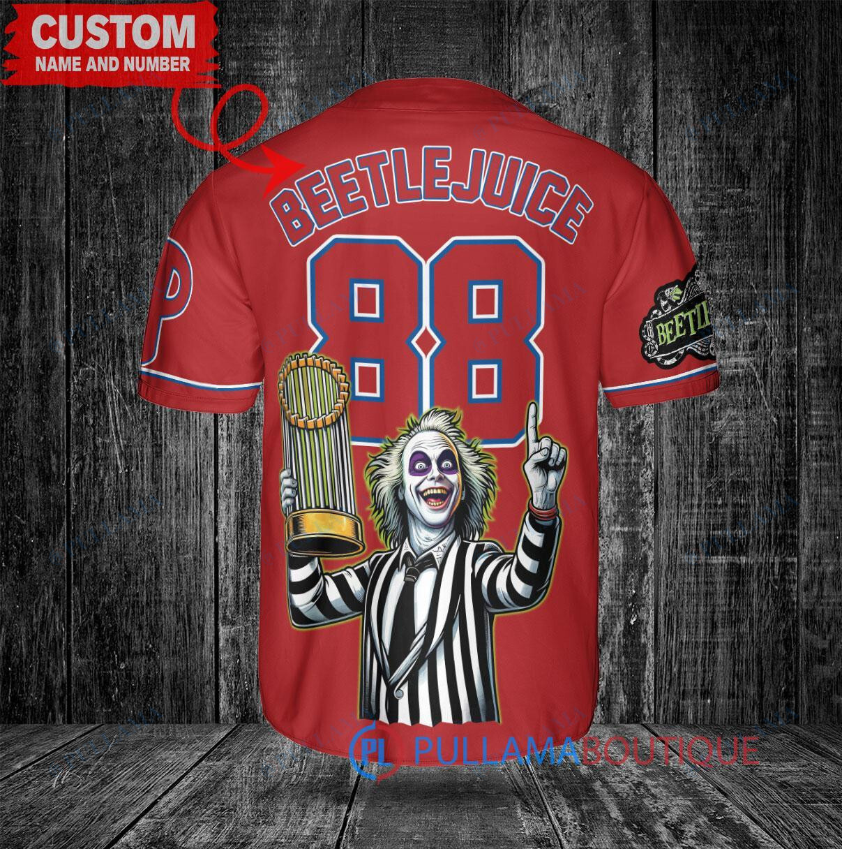 Philadelphia Phillies x Beetlejuice Halloween with World Series Trophy Custom Baseball Jersey Red