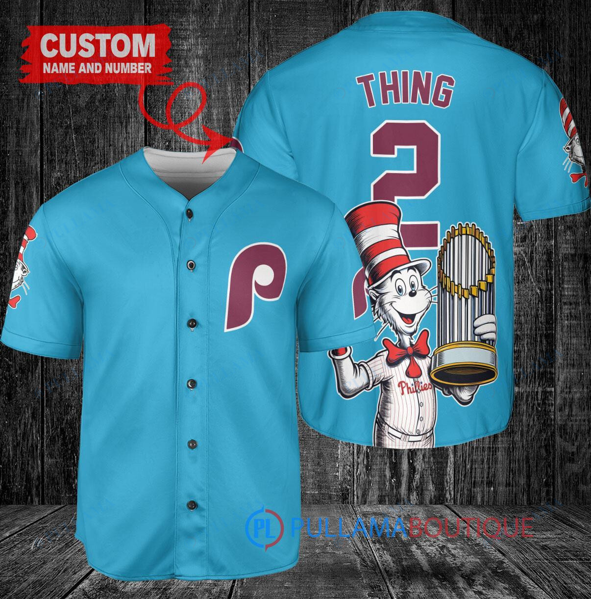 Show off your love for the Philadelphia Phillies in a fun and whimsical way with this custom baseball jersey featuring a Dr. Seuss design. The light blue jersey showcases the iconic World Series Trophy, adding a unique touch to your game day outfit. Made with high-quality materials, this jersey is perfect for any Phillies fan looking to stand out from the crowd. Get ready to cheer on your favorite team in style with this one-of-a-kind baseball jersey!