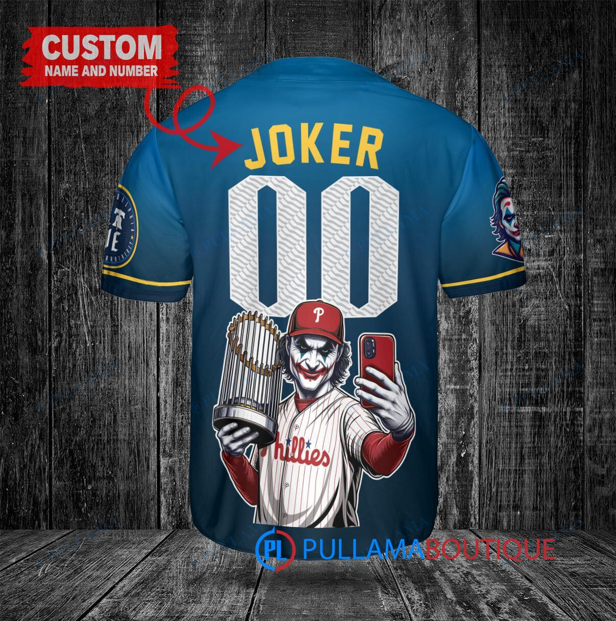 Show off your love for the Philadelphia Phillies and the Joker from DC Comics with this custom baseball jersey. The blue City Connect design features a trophy graphic, adding a unique and eye-catching touch to your game day outfit. Perfect for any baseball fan looking to stand out in the crowd.
