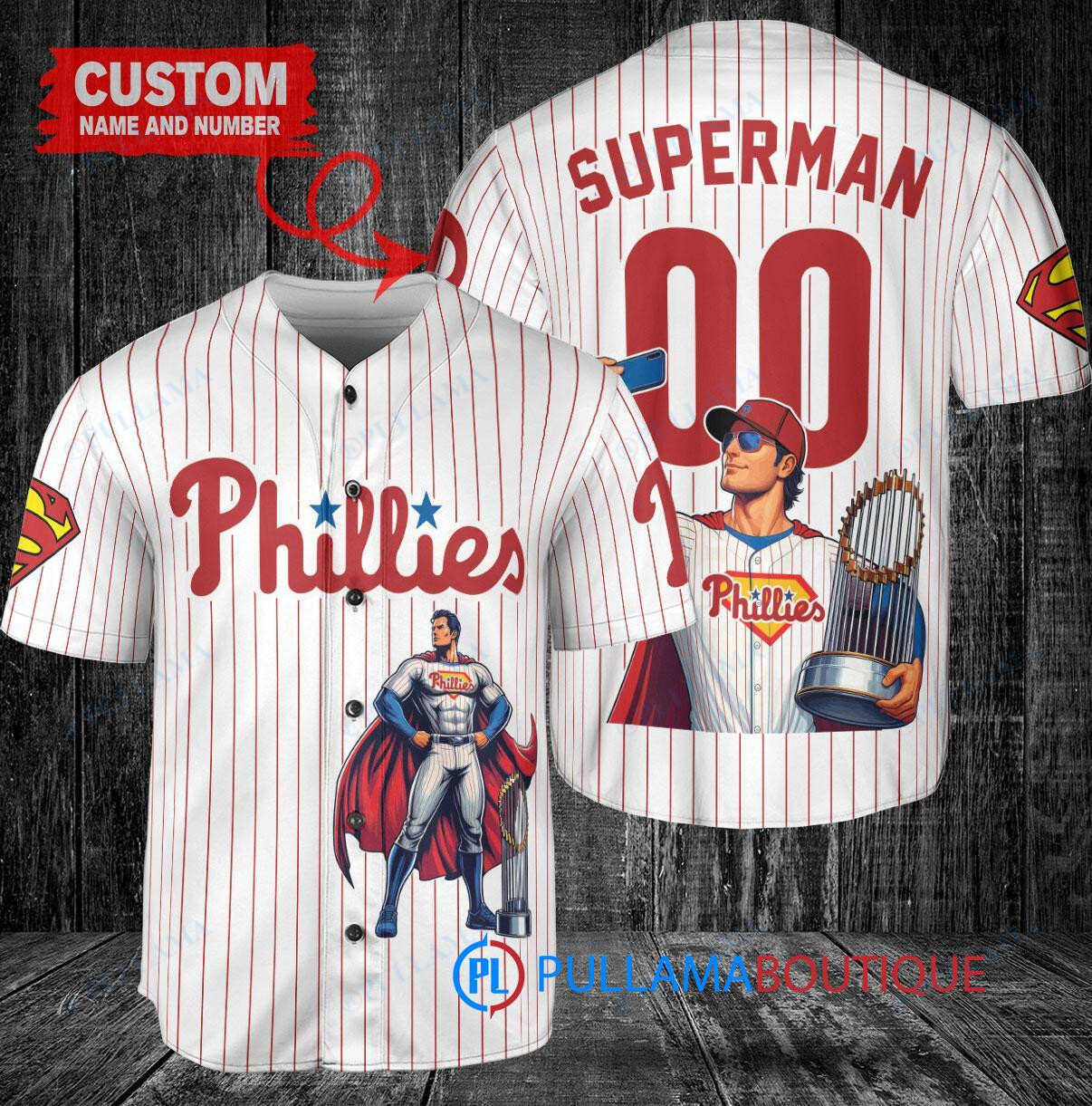 Show off your love for the Philadelphia Phillies and Superman with this custom baseball jersey featuring a unique DC Comics design. The white jersey showcases a trophy graphic, adding a fun and stylish touch to your game day outfit. Made with high-quality materials, this jersey is perfect for any baseball fan looking to stand out from the crowd. Get ready to hit a home run in style with this Philadelphia Phillies x Superman collaboration jersey!