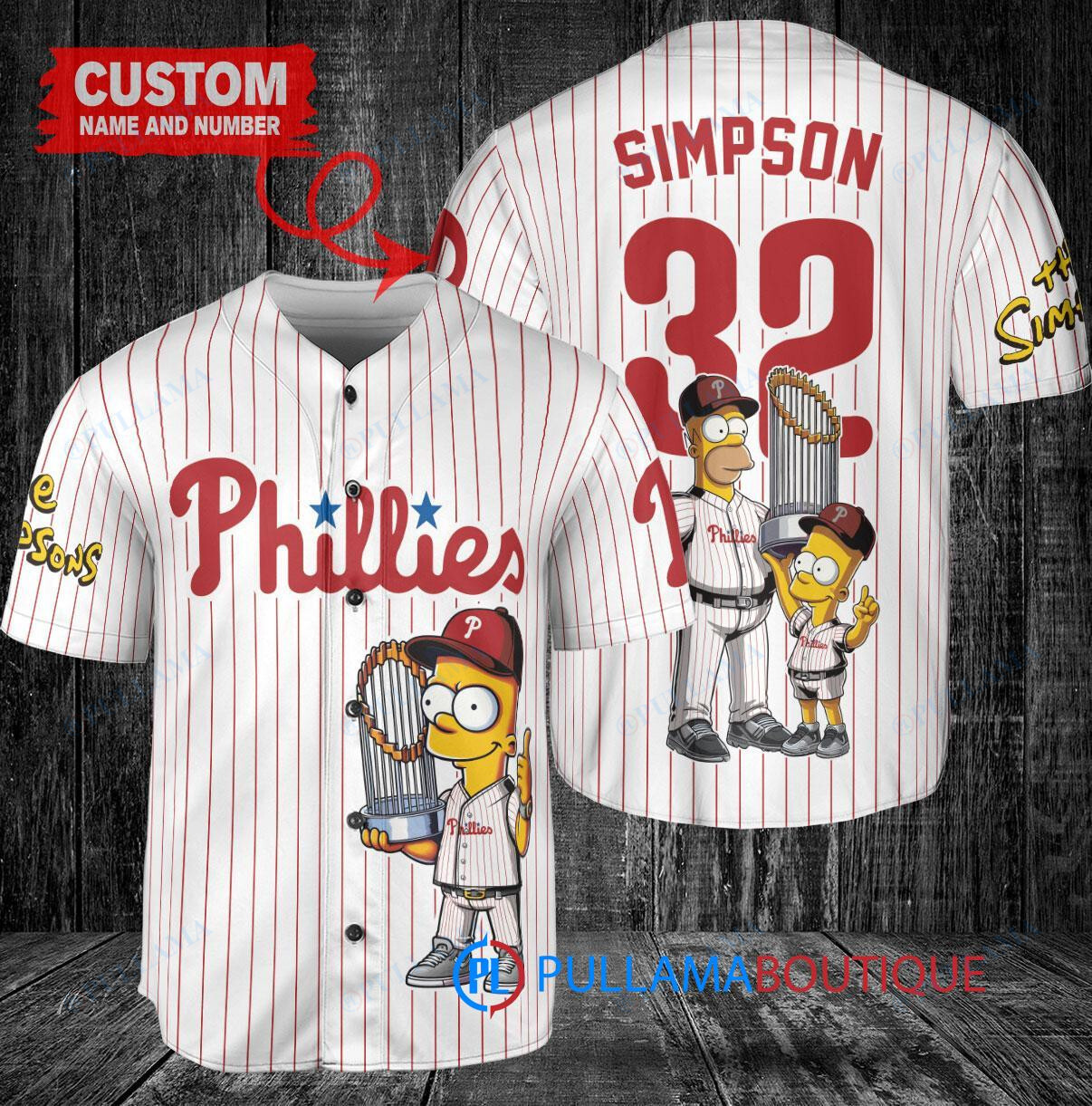 Show off your love for the Philadelphia Phillies and The Simpsons with this custom baseball jersey featuring Bart Simpson, Homer Simpson, and Lisa Simpson holding a trophy. This white jersey is perfect for any fan looking to stand out in the crowd. Made with high-quality materials, this jersey is both stylish and comfortable, making it a great addition to any fan’s collection. Get yours today and hit a home run with your style!