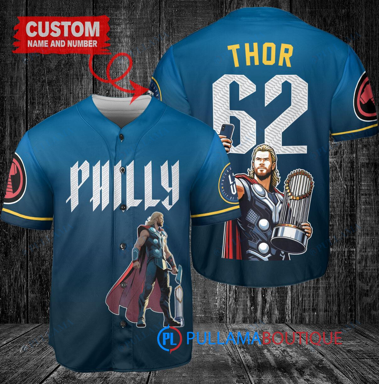Show off your love for the Philadelphia Phillies and Thor Marvel with this custom baseball jersey in blue City Connect design. This jersey features a unique combination of the Phillies logo and Thor Marvel character, along with a trophy design. Perfect for any fan looking to stand out in the crowd at the next game or event. Made with high-quality materials for comfort and durability. Get yours today and show your support in style!