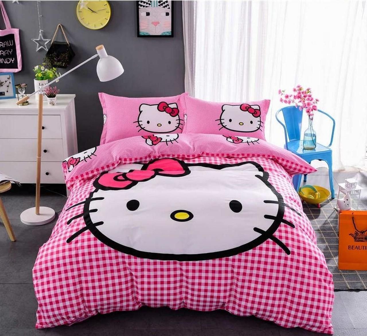 Pink White Plaid Hello Kitty Bedding Set Duvet Cover Pillow Cases
