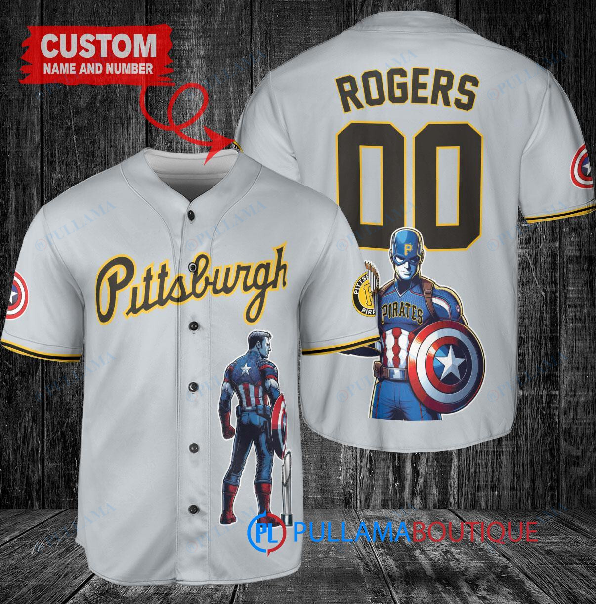 Show your support for the Pittsburgh Pirates with this officially licensed Marvel Captain America Steve Rogers baseball jersey. The gray jersey features the iconic Captain America shield logo on the front, along with Rogers’ name and number on the back. Made from high-quality materials, this jersey is perfect for any Pirates fan or Marvel enthusiast. Get ready to hit a home run in style with this unique and eye-catching baseball jersey.