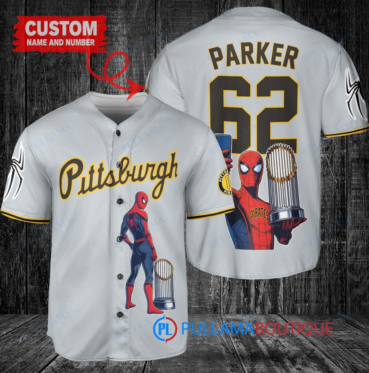 Pittsburgh Pirates x Marvel Spiderman with Trophy Custom Baseball Jersey Gray