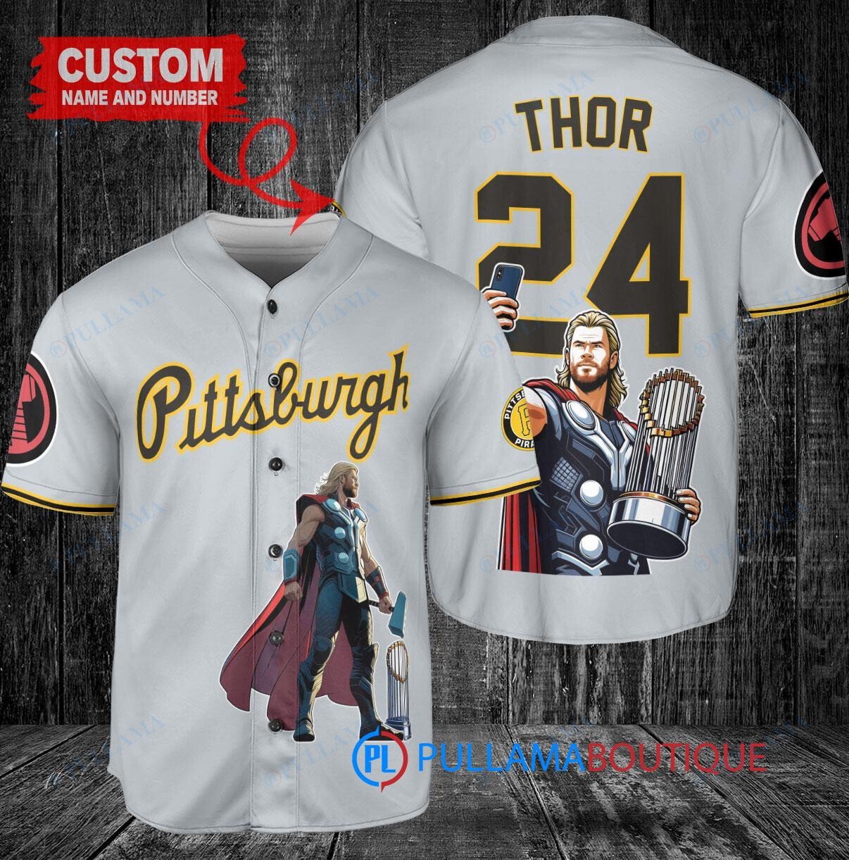 Show off your love for the Pittsburgh Pirates and Thor Marvel with this custom baseball jersey in gray. Featuring a unique design with the iconic Thor character and a trophy graphic, this jersey is perfect for any fan. Made with high-quality materials, this jersey is comfortable to wear while showing off your team spirit. Get ready to stand out at the next game or event with this one-of-a-kind Pittsburgh Pirates x Thor Marvel jersey.