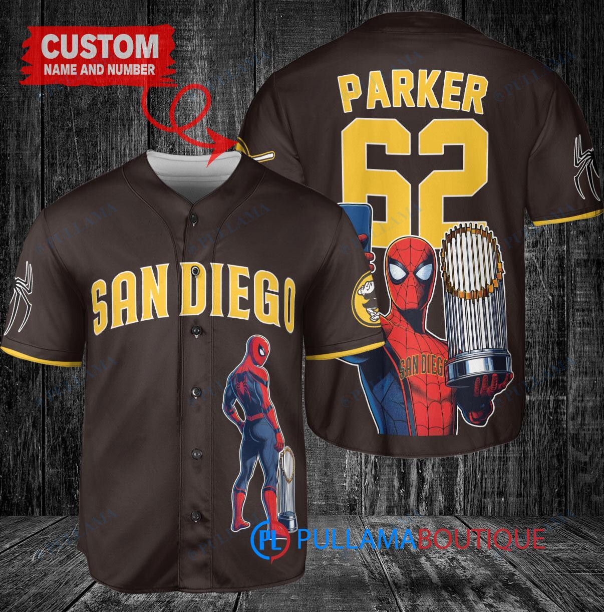 Show off your love for the San Diego Padres and Marvel’s Spiderman with this custom baseball jersey in brown. Featuring a unique design of Spiderman holding a trophy, this jersey is perfect for any fan looking to stand out in the crowd. Made with high-quality materials, this jersey is both stylish and comfortable, making it a must-have for any baseball enthusiast. Get yours today and swing into action with this one-of-a-kind jersey!