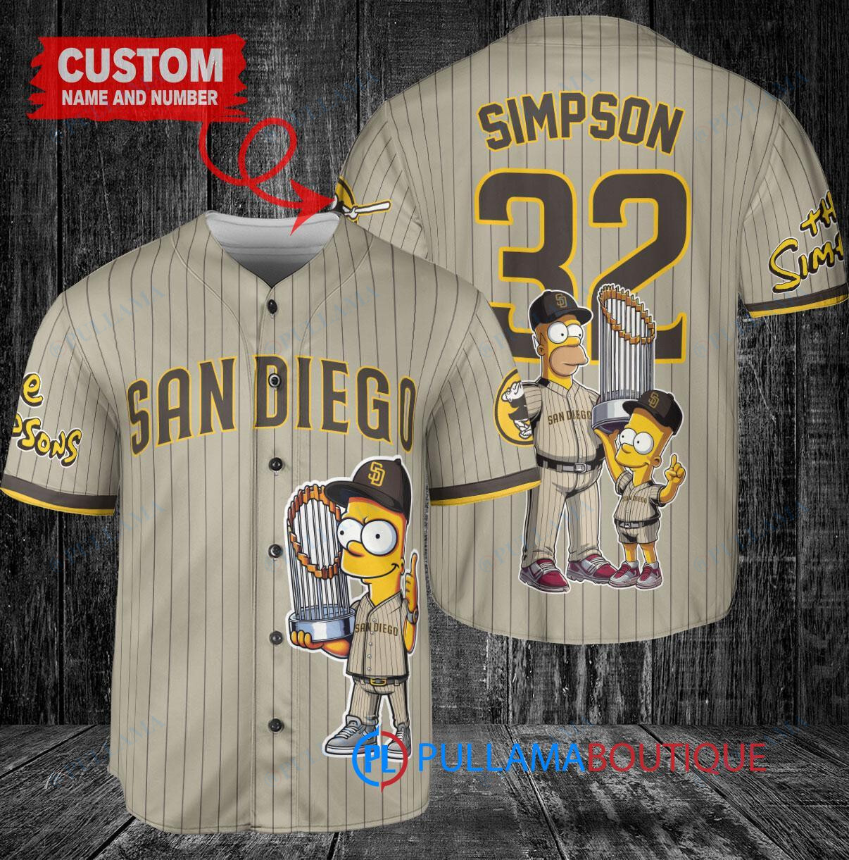 San Diego Padres x The Simpsons Bart Simpson, Homer Simpson, Lisa Simpson with Trophy Custom Baseball Jersey Tan