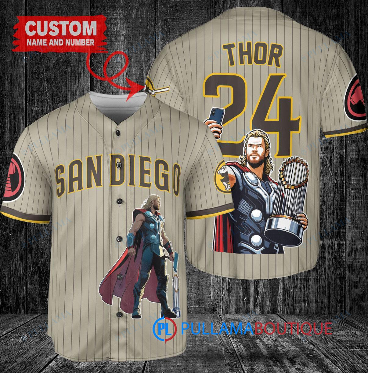 Show off your love for the San Diego Padres and Thor Marvel with this custom baseball jersey in tan. Featuring a unique design with a trophy graphic, this jersey is perfect for any fan looking to stand out in the crowd. Made with high-quality materials, this jersey is comfortable to wear while cheering on your favorite team. Get yours today and show your support in style!