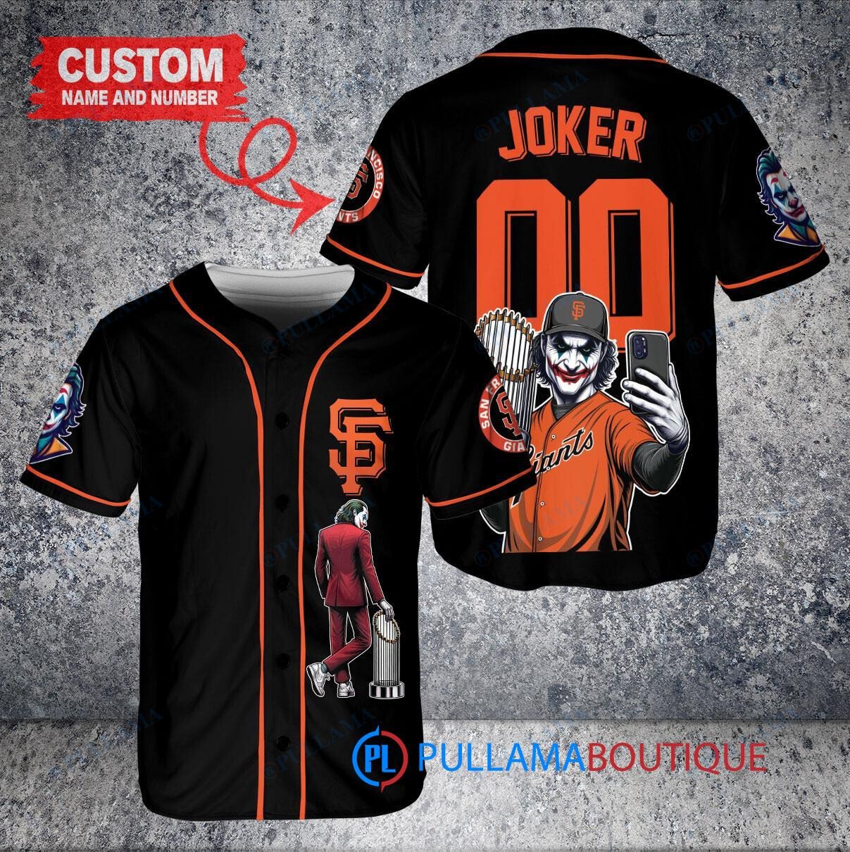 Show off your love for the San Francisco Giants and the Joker from DC Comics with this custom baseball jersey. The black jersey features a unique design with the Joker holding a trophy, perfect for any fan looking to stand out. Made with high-quality materials, this jersey is both stylish and comfortable, making it a great addition to any fan’s collection. Whether you’re heading to the game or just want to show off your fandom, this jersey is sure to turn heads.