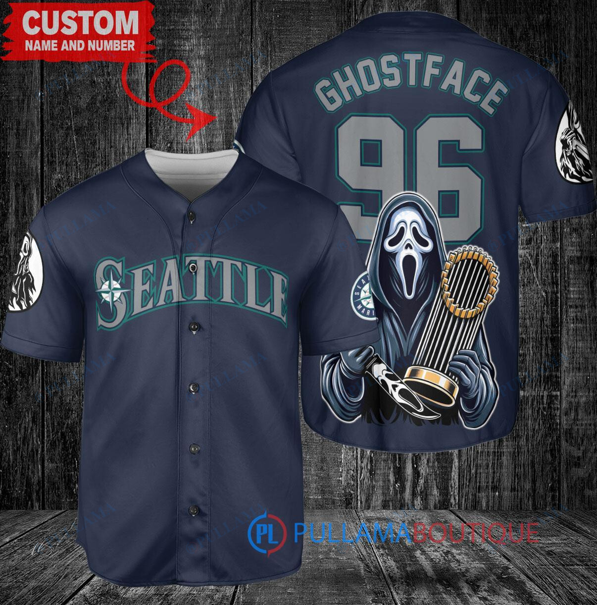 Get into the Halloween spirit with this custom Seattle Mariners x Ghostface Scream Halloween Baseball Jersey in navy. Featuring a unique design with the World Series Trophy, this jersey is perfect for any baseball fan looking to show off their team spirit during the spooky season. Made with high-quality materials, this jersey is sure to be a hit at any Halloween party or game day event. Add a touch of frightful fun to your wardrobe with this one-of-a-kind baseball jersey.