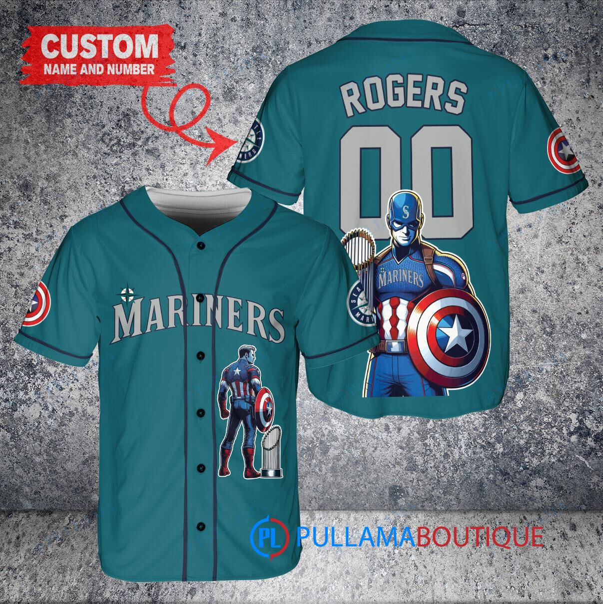 Seattle Mariners x Marvel Captain America Steve Rogers with Trophy Custom Baseball Jersey Aqua