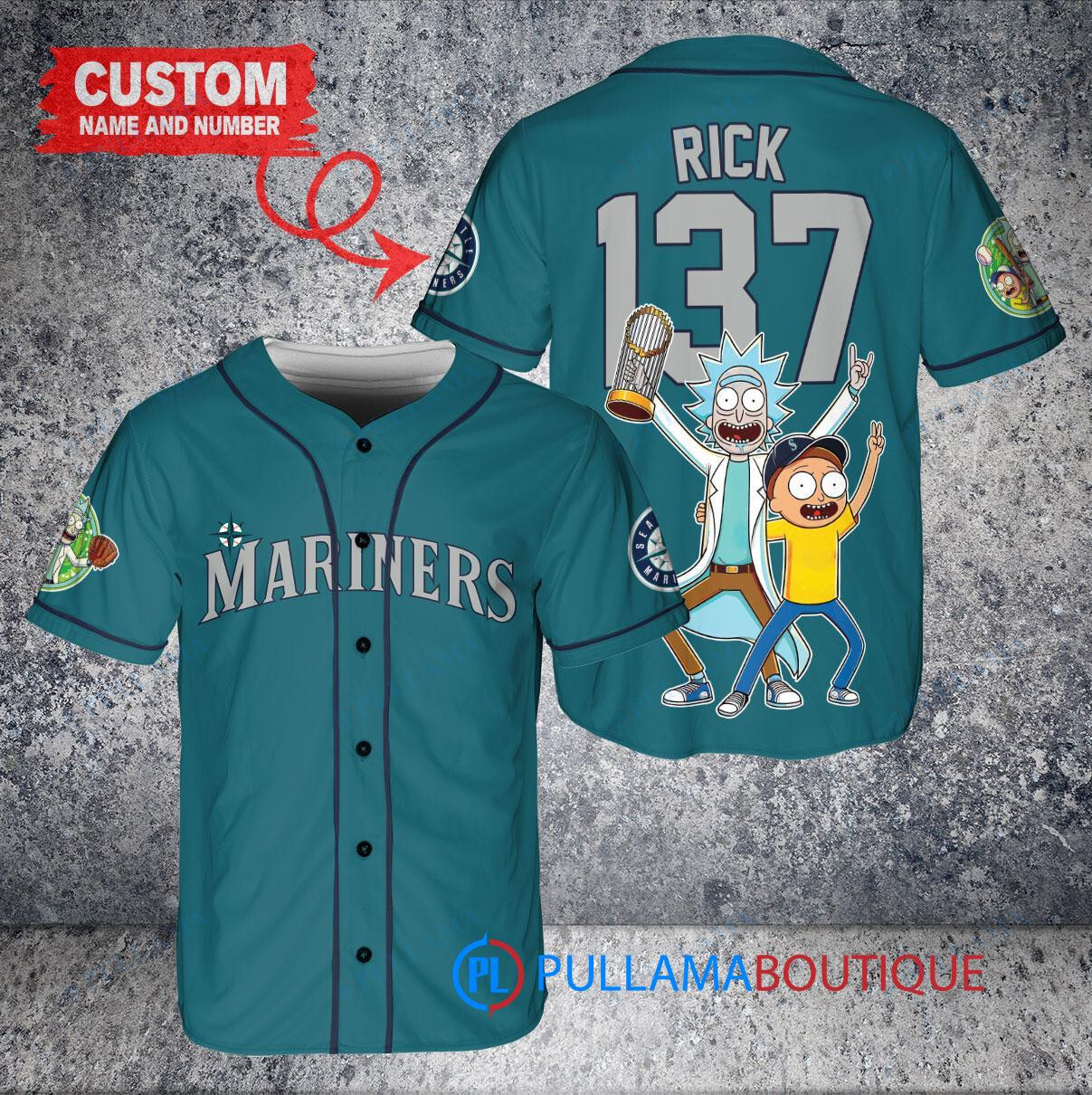 Show off your love for the Seattle Mariners and Rick and Morty with this custom baseball jersey in aqua color. This unique jersey features a trophy design, perfect for any fan looking to stand out in the crowd. Made with high-quality materials, this jersey is perfect for game days or casual wear. Get yours today and show your support for your favorite team and TV show!