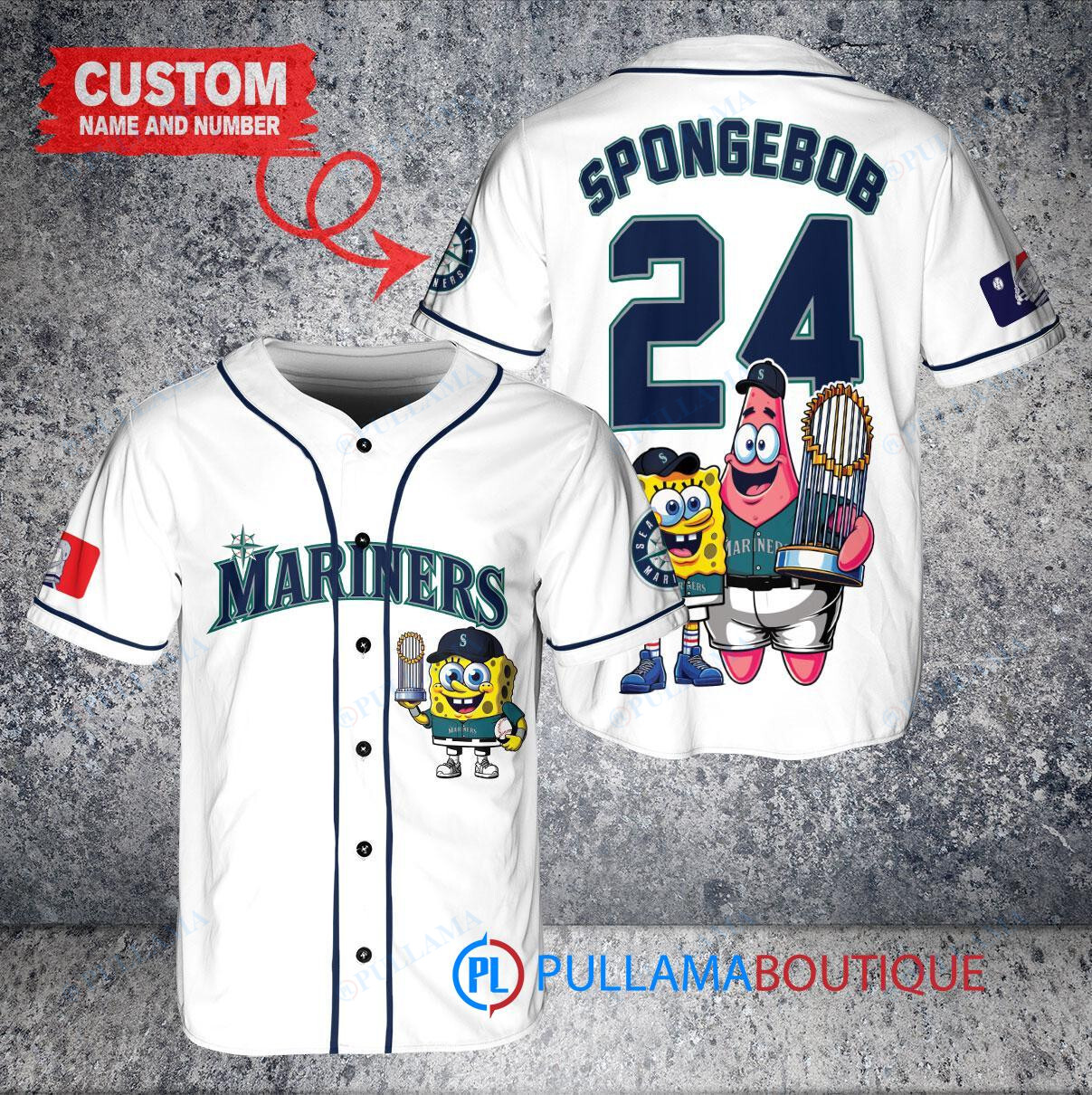 Show off your love for the Seattle Mariners and SpongeBob SquarePants with this custom baseball jersey in white. Featuring a unique design with the two iconic logos and a trophy graphic, this jersey is perfect for any fan looking to stand out in the crowd. Made with high-quality materials, this jersey is comfortable to wear while cheering on your favorite team. Get yours today and hit a home run with your style!